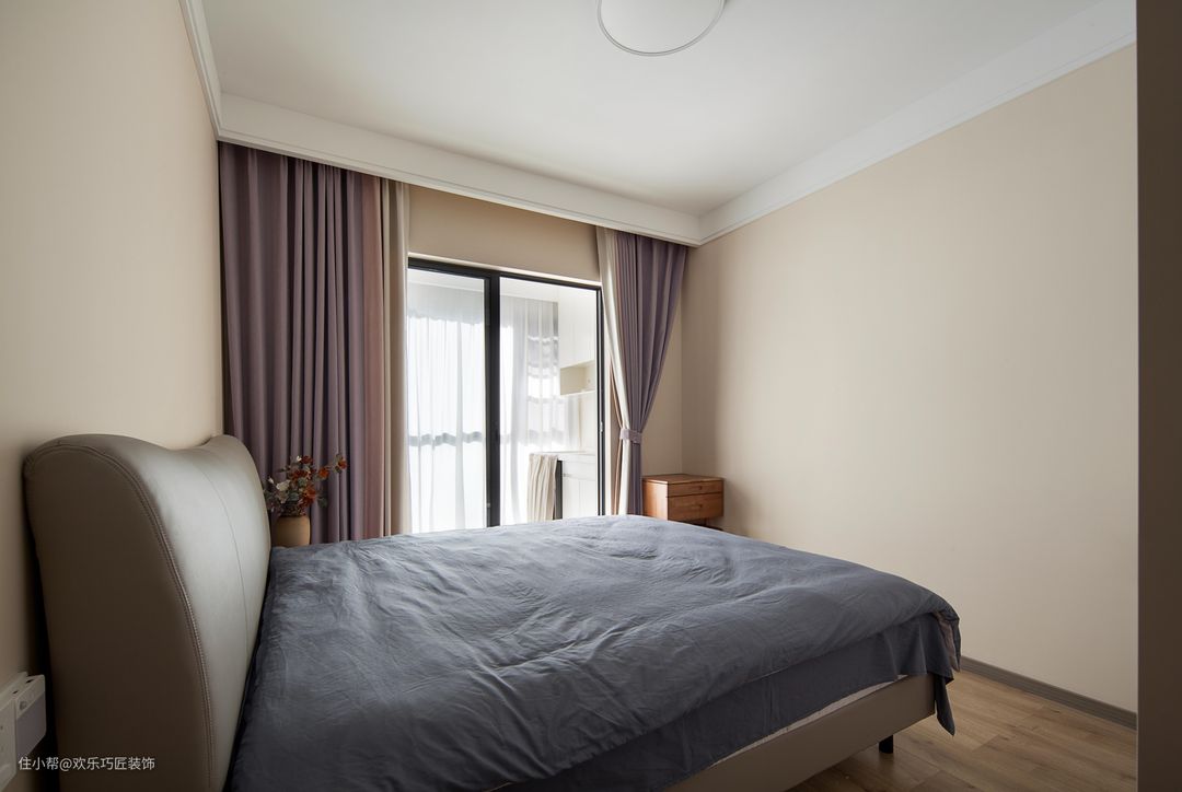 卧室的色调以浅色为主,赋予空间扩张感,素雅的柜子+木地板,随着自然阳光的涌入,呈现出一种简约朴素的惬意氛围。