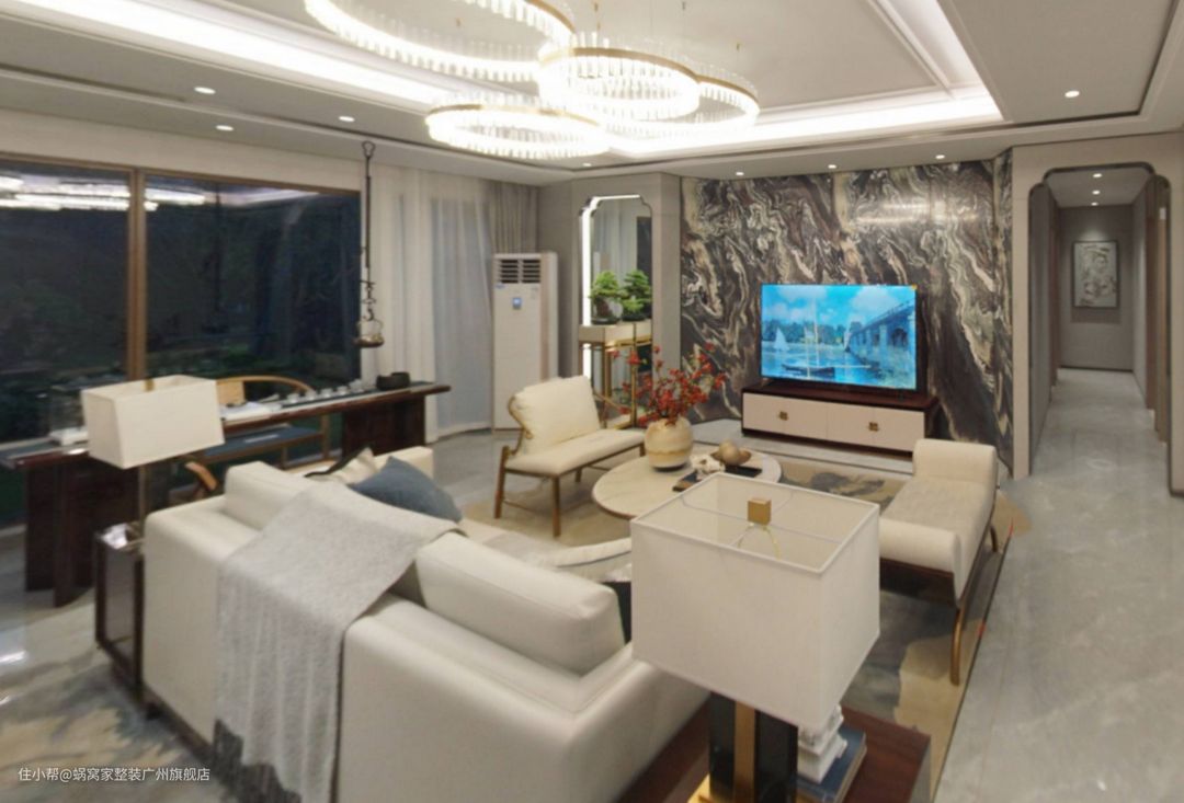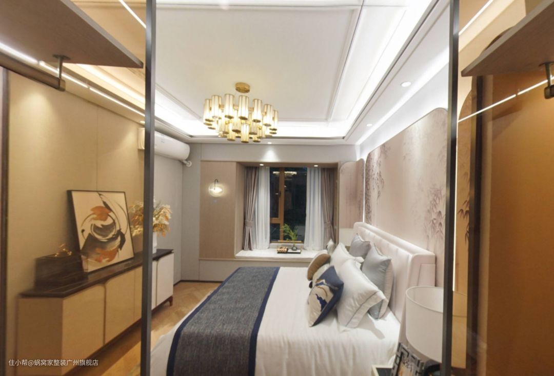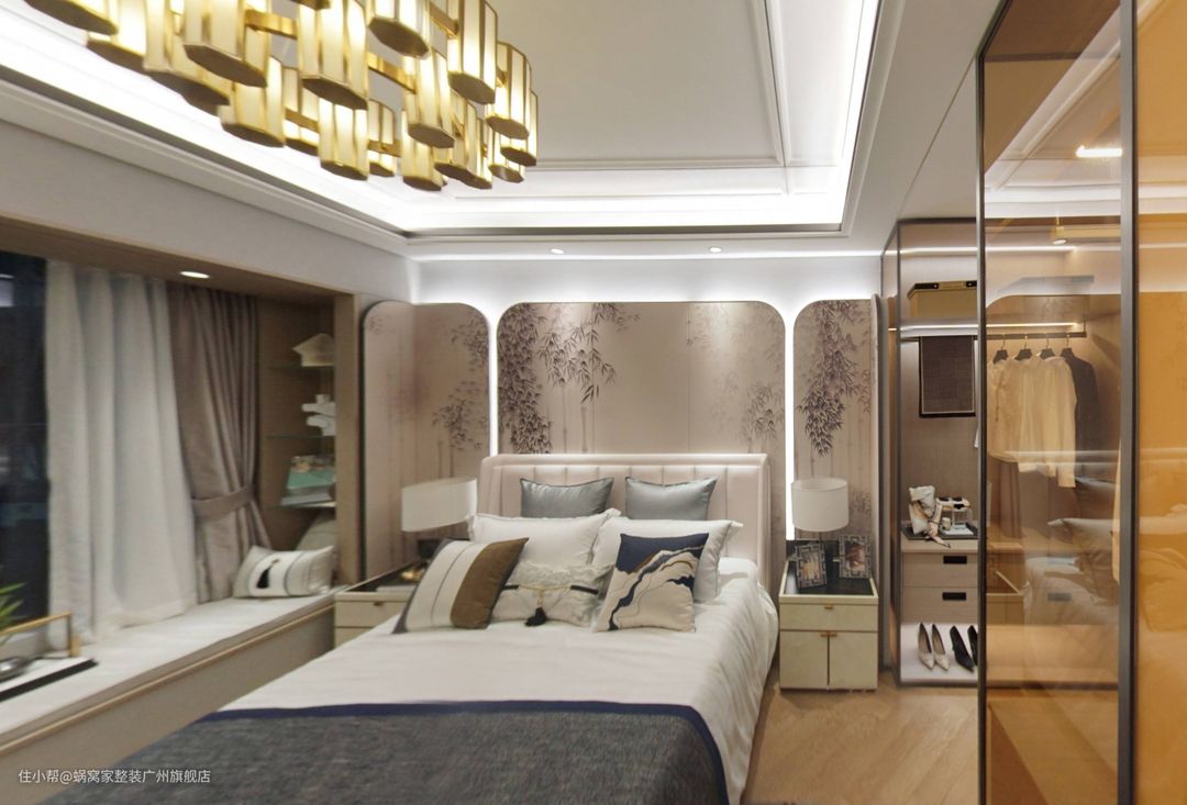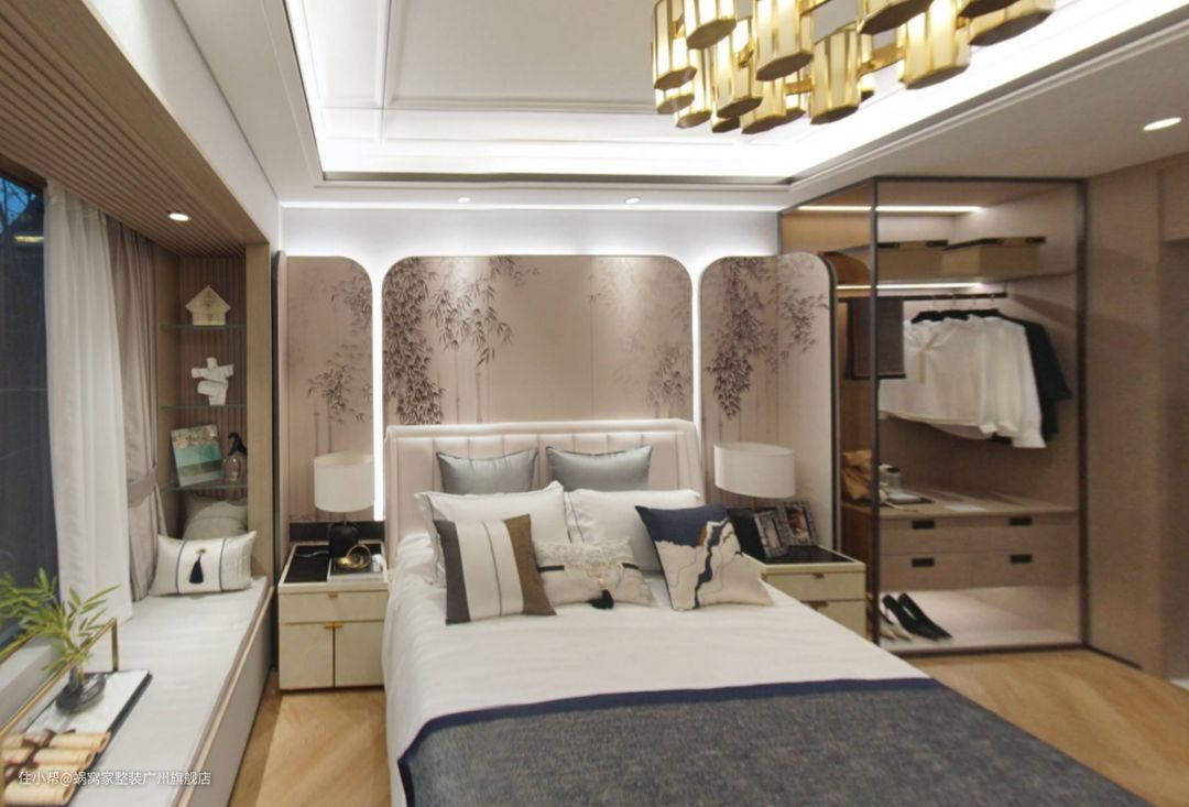 主卧呈现出一派奢华、高贵的氛围,令人心旷神怡。床头屏风新中式设计,线条优雅,工艺精湛,尽显高贵气质。大水晶吊灯悬于房间中央,璀璨夺目,为空间增添了几分奢华感。整个房间充满了浓厚的艺术气息和独特韵味,仿佛置身于一个远离尘嚣的艺术世界。在这里,可以感受到新中式设计的独特魅力,品味高雅、舒适的生活方式。无论是床头屏风的细腻纹理,还是水晶吊灯的闪耀光芒,都让人流连忘返,沉醉其中。