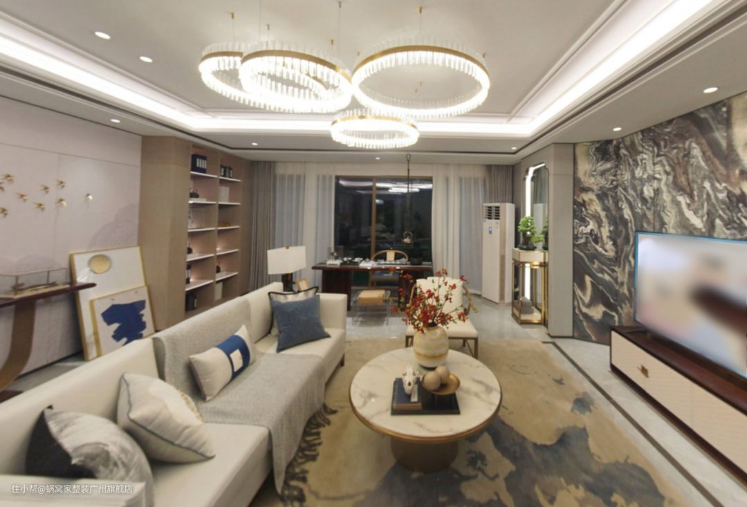 客厅内,一盏大水晶吊灯璀璨夺目,由多个圆形的灯罩组成,散发出柔和的光芒。浅色皮质沙发质感柔软,舒适度高,是放松身心的理想之选。深色地毯铺满地面,不仅起到装饰作用,还能有效地吸收脚步声,增加室内的安静感。整个客厅设计简约而不失格调,营造出温馨而舒适的氛围,是家庭聚会或朋友聊天的理想场所。