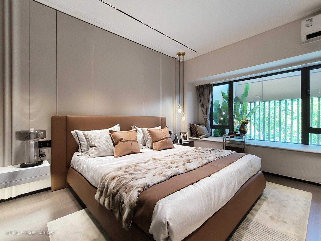 主卧是延用的现代风格的设计,整体的色调是以奶白色+棕色相搭配,柔软的棕色床靠背,让人使用起来更加的舒服,侧边搭配的悬浮床头柜更加高级。浅咖棕色的木地板,床上搭配的高定6件套,整个空间色彩和材质都极度的舒适温馨。 主卧的面积比较大,保留了飘窗的设计,飘窗处放上两个抱枕,平时可以和家人坐在飘窗处喝喝茶也是十分惬意的!床尾处是我们女屋主的梳妆台,黑色的极简梳妆柜,延伸至飘窗,开放式的收纳放置化妆品也能一目了然;主卧同客厅的设计一致,打造的是无主灯的设计;墙面挂置的是抽象现代画,居住的氛围感拉满。