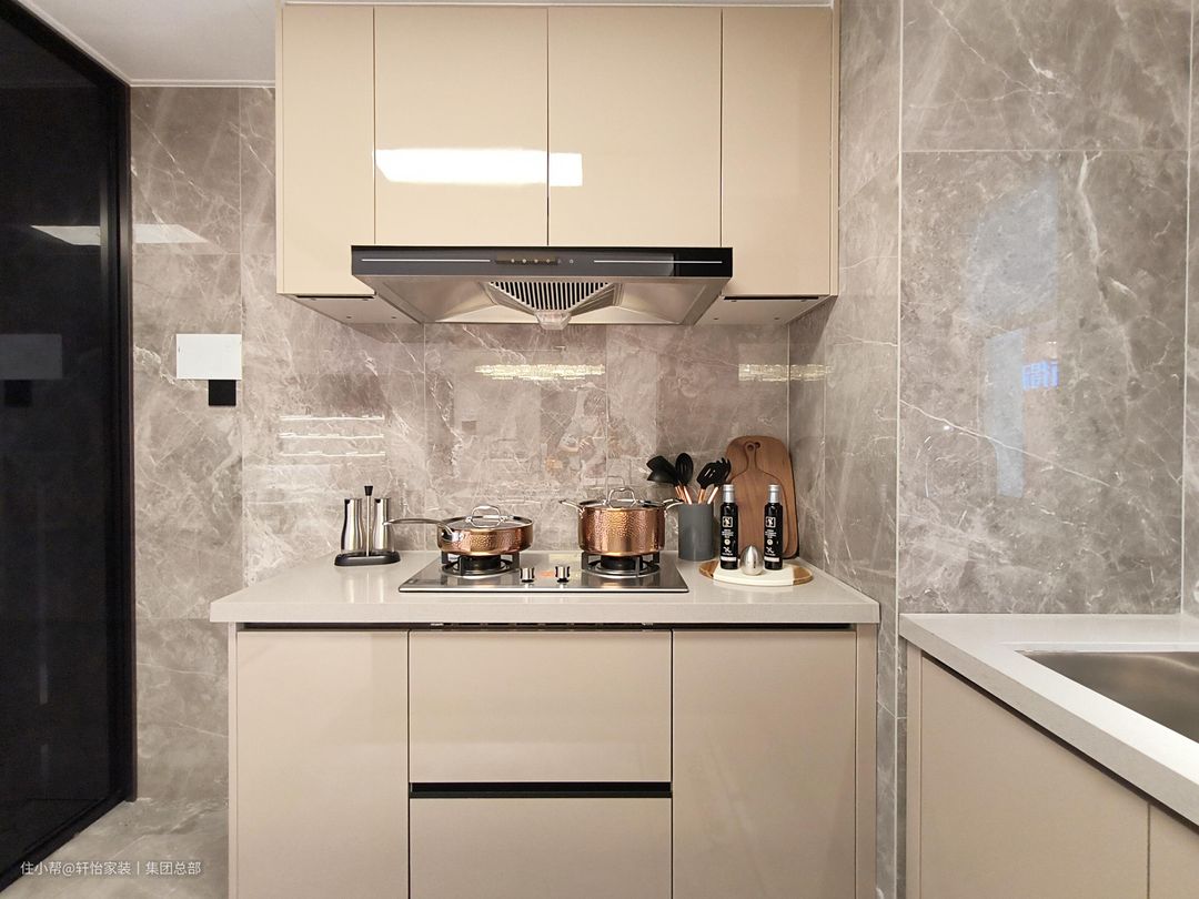 屋主们平时喜欢下厨,而且还想要开放式的设计,考虑到厨房的使用频率比较高,所以就打造成为半开放的设计,采用的U型台面设计,打造收纳橱柜+地柜,让厨房的收纳更加的充裕,半开放式的设计对于爱好甜点的女屋主来说,可以更好的和家人进行沟通互动,增进情感交流~ 一面的台面打造成吧台,可以作为我们女屋主的甜点传递窗,可以尽情的展示“作品”,我们这样的半开放式的厨房设计深得屋主们的喜爱~