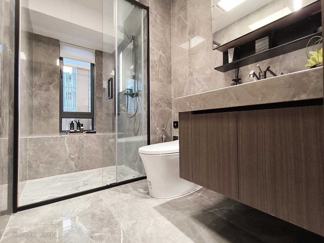 客厅同主卫的设计一致,打造的同样的是干湿分离式设计,柜子方向和主卫呈现镜像面,整体是浅灰色的瓷砖,视觉上显的统一,卫生好清洁打造~ #干湿分离 #卫生间 主卫呈现的是长方形的整体布局,两段式的干湿分离,洗浴清洁互不打扰,整体的瓷砖采用的是浅灰色系,墙地砖选用的是同款瓷砖,淋浴区使用的黑边玻璃门,防止水渍乱溅。 洗手区底部是镂空设计,洗手柜是开放式+门柜设计,开放式设计可以放置纸巾、香薰等,方便顺手还实用,主卫无挡水条,柜子底部是镂空设计,减少卫生死角、好打理。