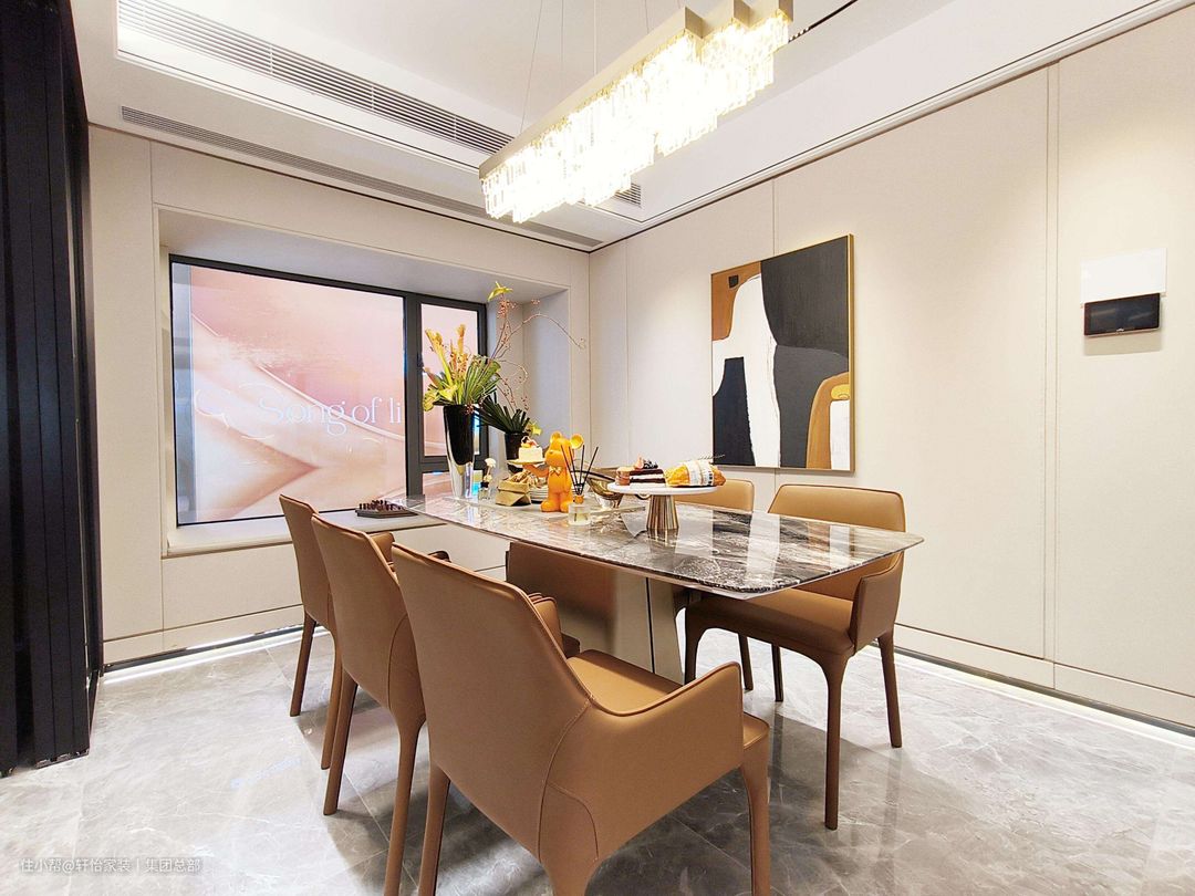 餐厅的餐桌是六人位的方形餐桌,棕色的皮质餐椅,可以同时容纳对人就餐,完美的诠释了屋主们对于温馨家庭氛围的期待,餐厅和客厅虽任处两个空间,但是生活氛围同样很温馨。 餐厅位于厨房正前方,餐厨一体化,动线合理,大理石式的餐桌,挂置的是大气水晶灯,就餐更加有仪式感!
