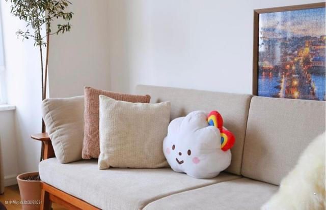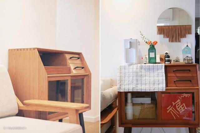 扶手可以充当一个小边几放放书本或者水杯,用起来很顺手沙发旁放了一张小的餐边柜,这是业主很早之前就看中的,放在沙发旁边刚刚好合适。