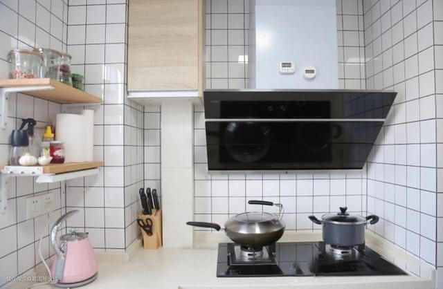为了增加收纳,墙面上安装了不少置物架,把瓶罐都有秩序的收纳起来,整个厨房看起来更加的干净整洁了。业主说:当厨房的灯亮起时,房子就变成了家。