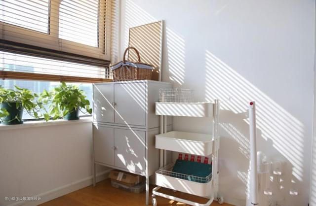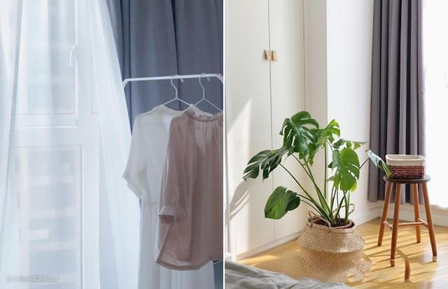 主卧的阳台是飘窗改的,一层纱帘+一层亚麻遮光帘,种上绿植,太美了。