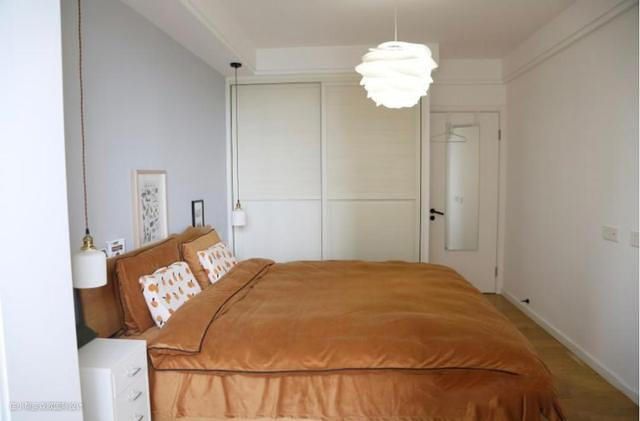 主卧不大但是很温暖,床头背景墙面刷了浅灰色墙漆搭配原木色的床,和两个白色的吊线灯,很精致。时不时的更换床品的风格,常换常新,温暖又治愈。衣柜里也没有做太多隔断,主要都是靠抽屉收纳盒,一把收纳的好手