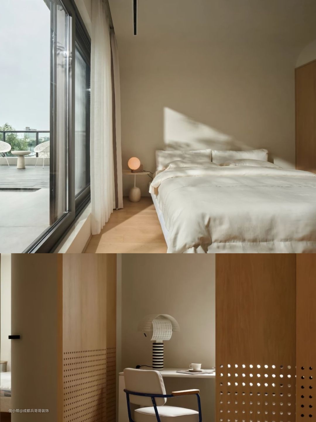 卧室,一米八宽、两米宽的床都可以放下,通顶式衣柜+转角书桌设计,满足日常储物,收纳还足。整体色彩以原木色+简约白为主色调,简单自然,与全屋风格相得益彰。