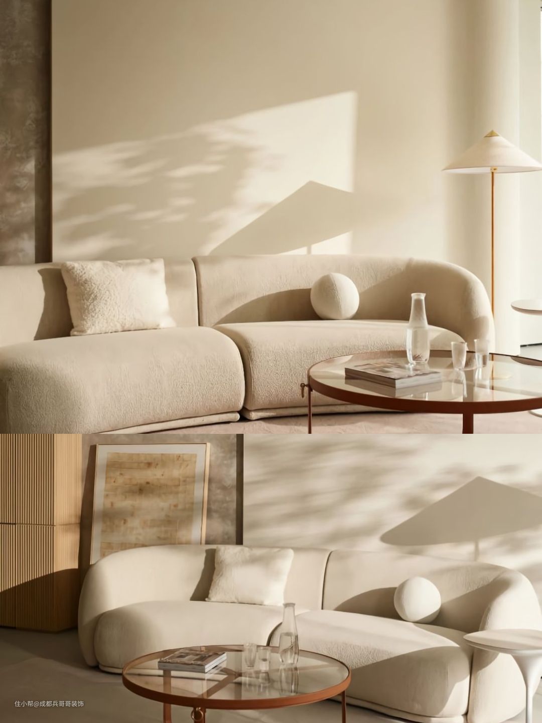 客厅,摆放了布艺沙发、几何茶几、电视区,开放式设计空间感更好。光线在室内产生丰富的变化,窗外的树影映入室内墙角,摇曳生姿,美丽动人,空间充满了灵动性,让人念念不忘。