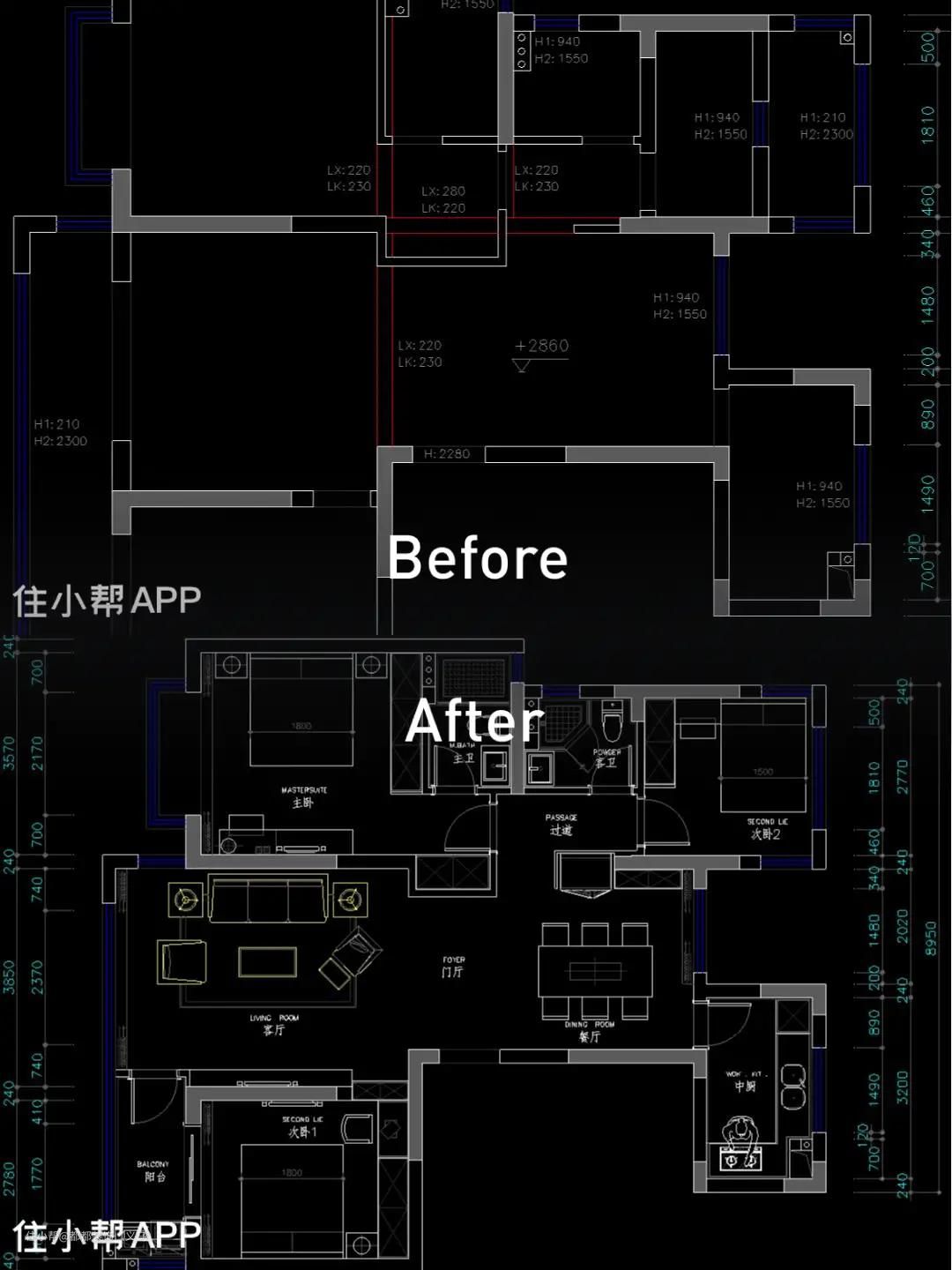 1、餐厅位置墙体拆除放了冰箱,跟餐边柜做平; 2、电视柜背景做了双面使用,后面侧边做了书桌; 3、打通次卧墙体,增大空间。