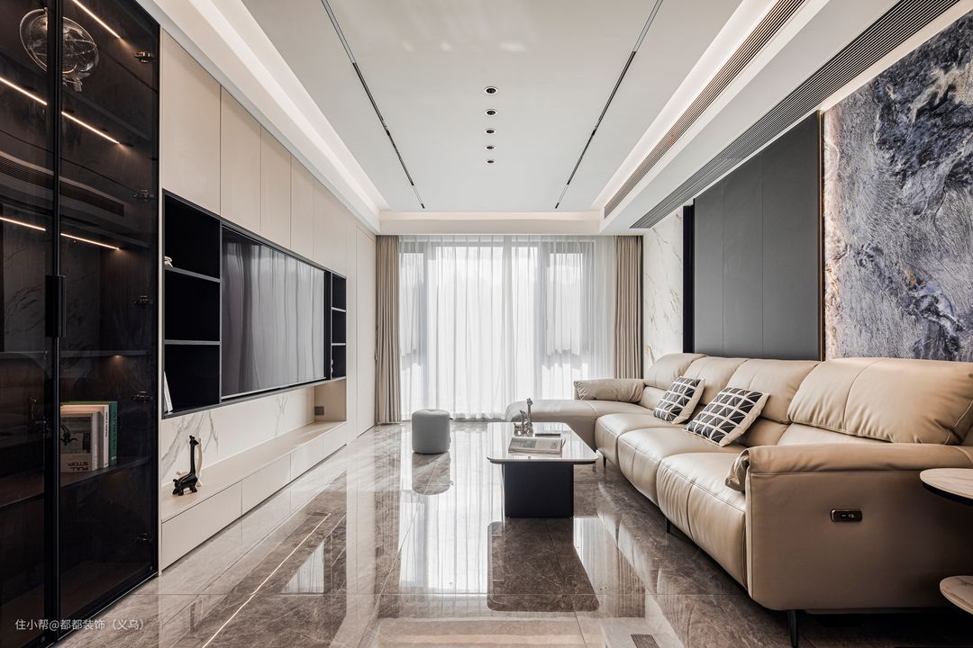 客厅拥有大大的落地窗,阳光透过白纱窗帘洒落在整个空间,开阔明朗,温馨治愈。 无主灯的设计,让整个客厅显得更加清晰明朗,没有压抑感;磁吸轨道灯与嵌入式射灯相结合,不仅让空间更有纵深感,也使得整体光线环境更加舒适,氛围感满满。 电视背景墙做了封闭式柜子+开放式格子+侧边玻璃柜的设计,让储物与展览两者兼顾,各式各样的摆件和书本也体现了主人的品味和格调;嵌入式的电视以及隐形门的设计也让整个空间更加和谐统一。 沙发背景采用拼接设计,不同花纹的大理石结合黑色木饰面做了材质碰撞,带来全新的体验;大理石与木饰面连接处还有隐藏灯带,让视觉更显氛围感,也是十分吸睛! 米白色的L型皮质沙发,质感十足,配上大理石茶几,布置创意摆件,营造温馨舒适的家居生活。