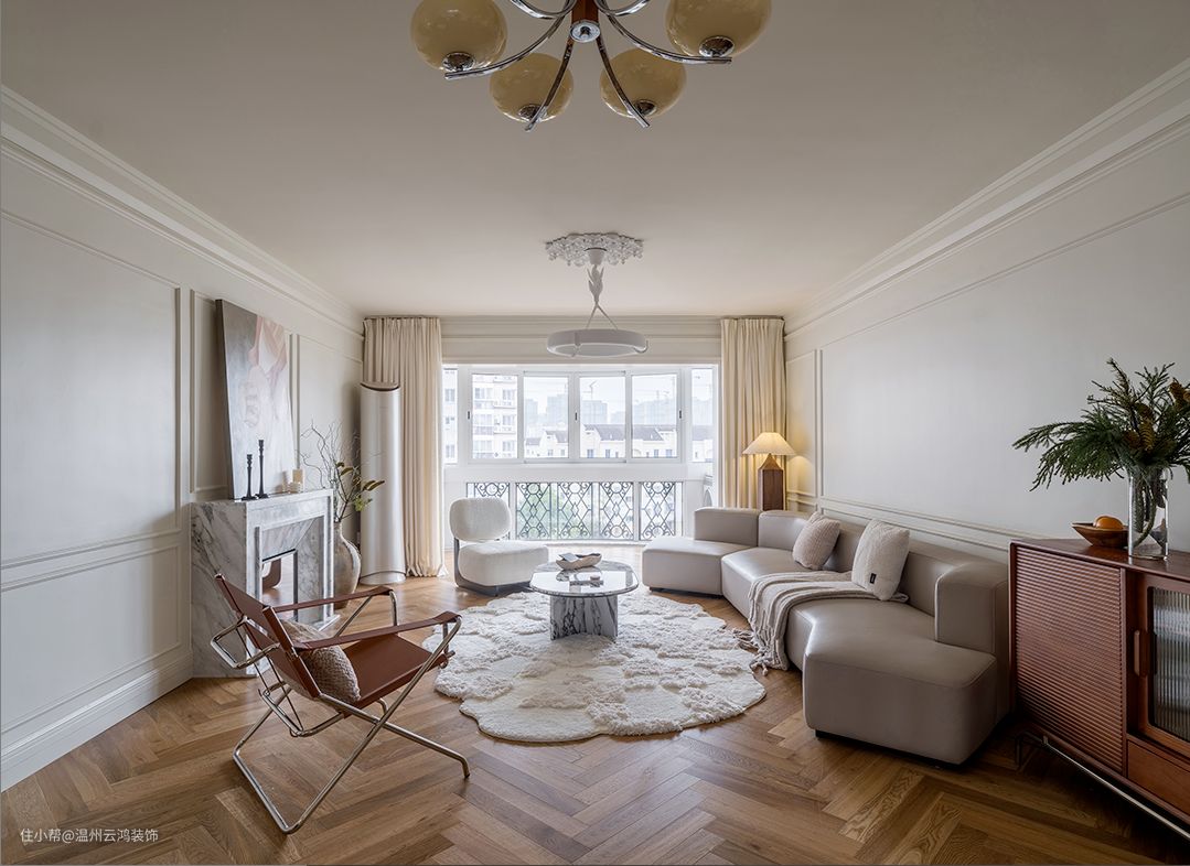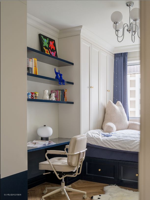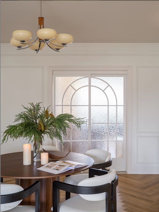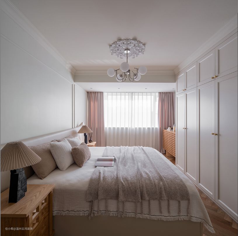 卧室里的法式中古风格极为简约,为梦编制一个洁白的故乡。 造型与色彩极简的床头设计,搭配精心挑选且带有中古风的床头柜、边柜、吊灯,都直观地表达了女主人的审美价值——追求时尚与复古均衡且微妙的美。