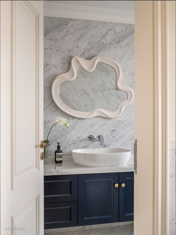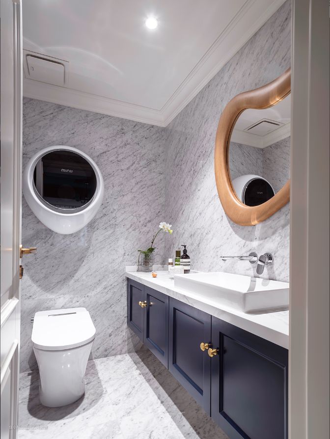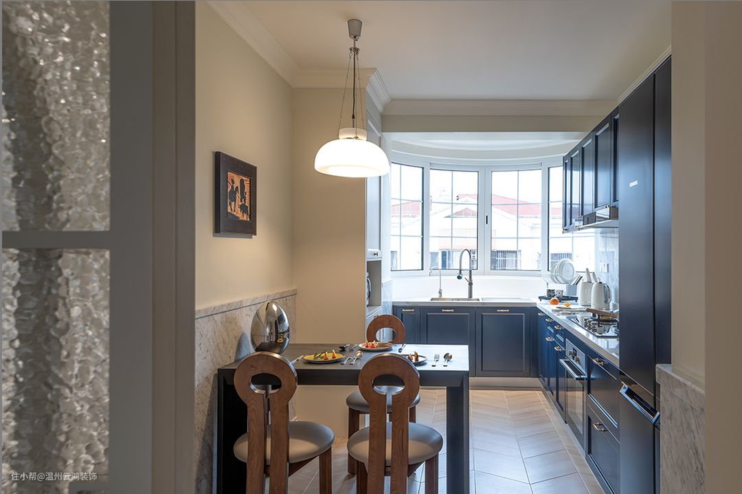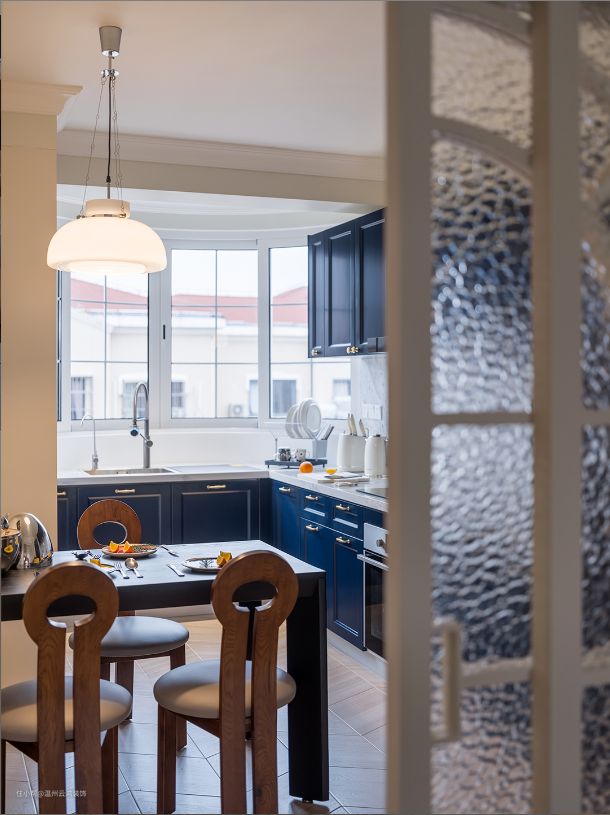 厨房使用的卡拉拉白大理石,墙面搭配深蓝色橱柜,令这款法式设计带着既时尚又复古的味道。 餐椅、餐具、灯具,和异型镜面,都体现了主人独特的审美趣味。而一家三口的用餐在厨房便可解决,方便且温馨。