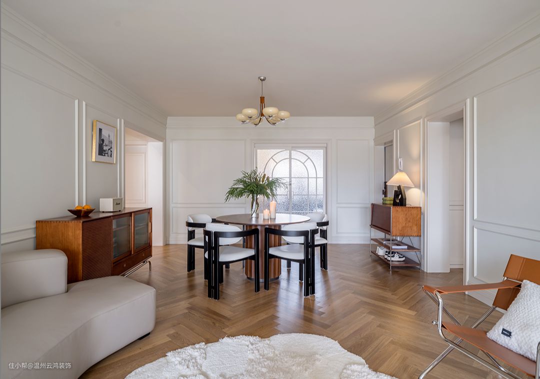 带有中古风的灯饰、边柜、餐桌,以及略带诧寂感的原木装饰物、装饰画等,这些都给空间增加了跳动的乐符,赋予了这款家居空间专属的气质和个人的品味。