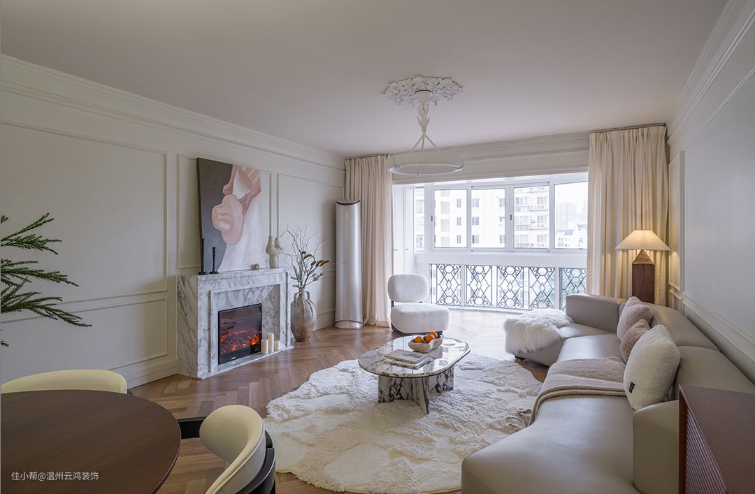 客厅里,柔软的白色苔藓地毯搭配大理石的壁炉和茶几。以及黑白配色的餐椅都体现了女主人在这个家的设计中对时尚有所克制的追求。