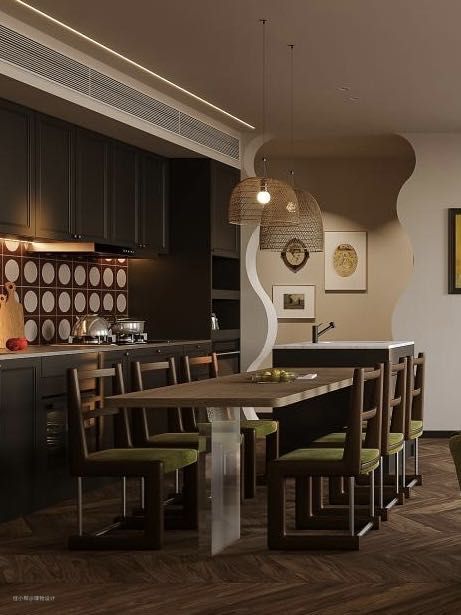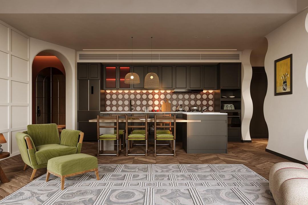 岛台+餐桌设计,搭配牛油果绿色餐椅,空间秩序感不言而喻。