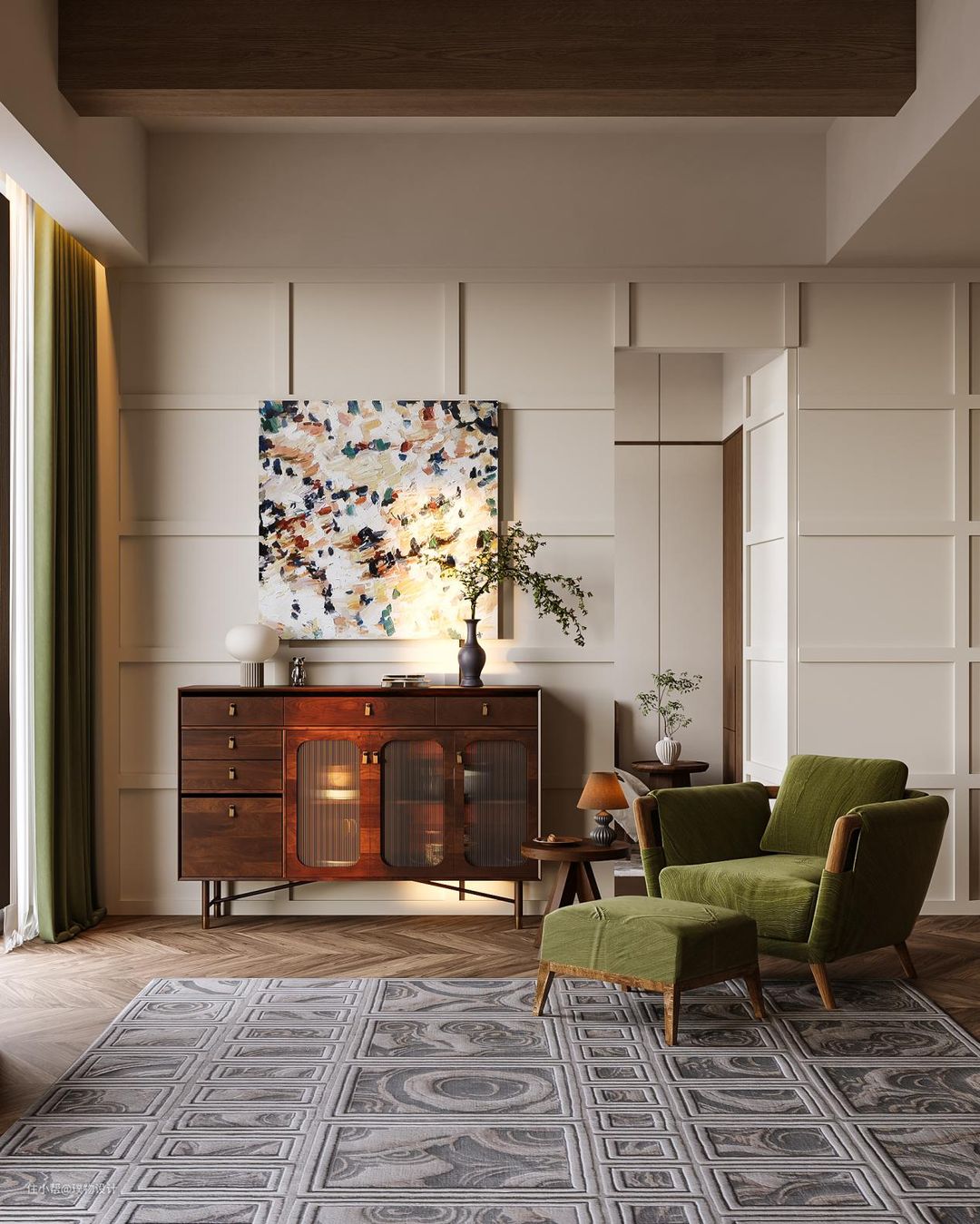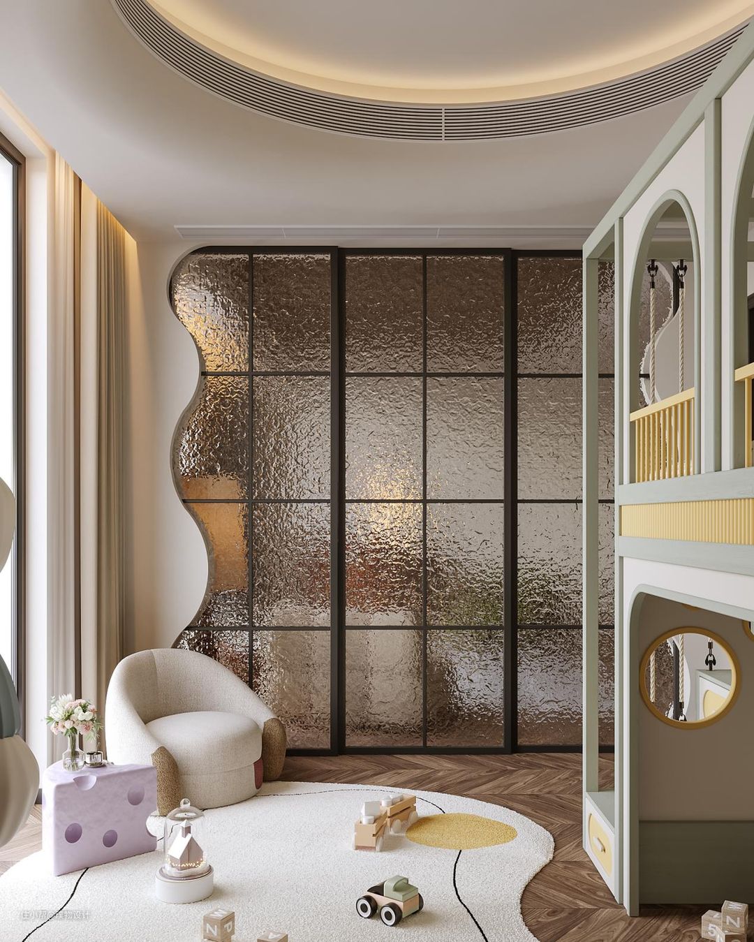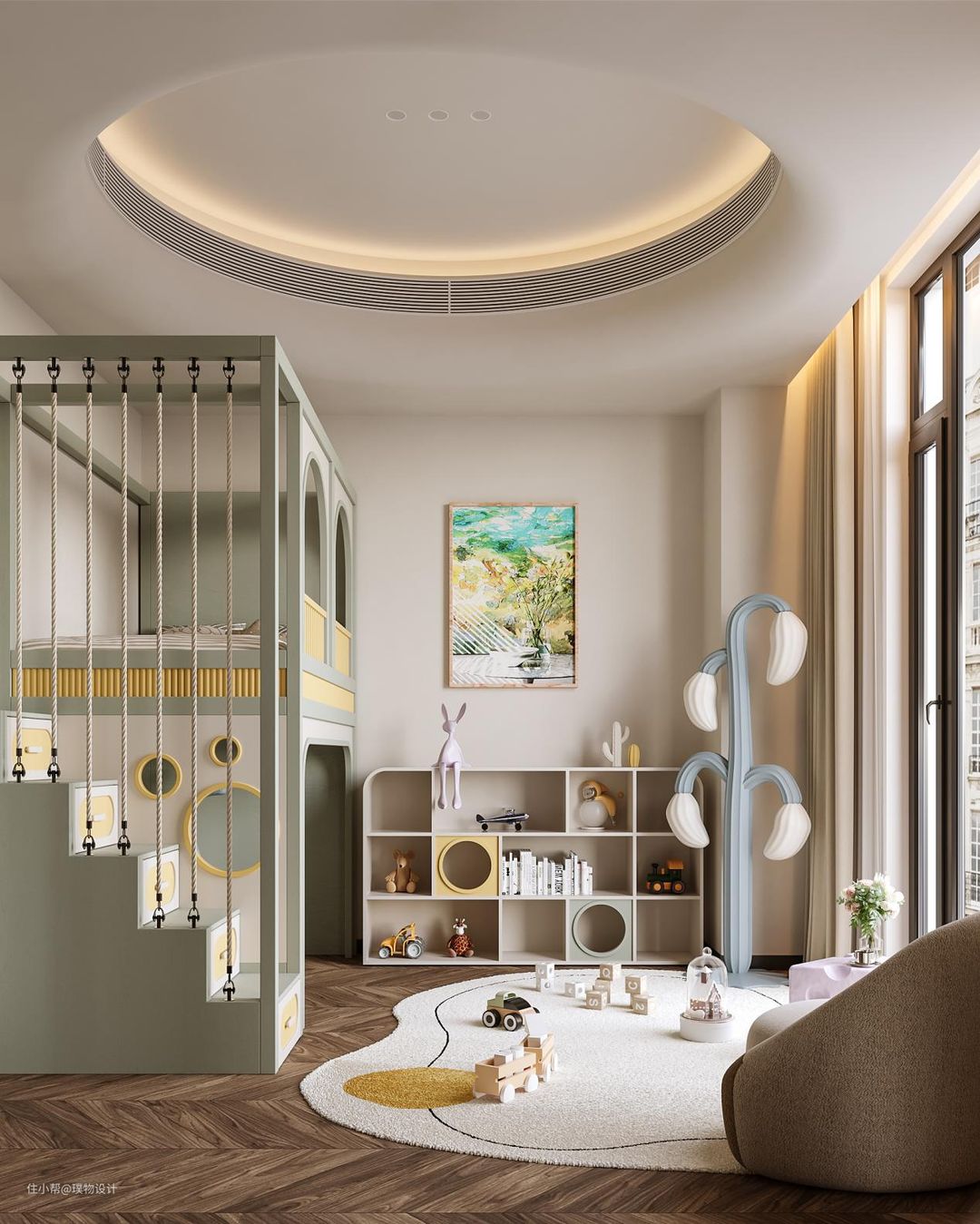 儿童房未做过多的定制类产品,而是采用成莫兰迪配色家具,让孩子能接受更多的色彩识别,松软的地毯让孩子可以自由地玩耍。