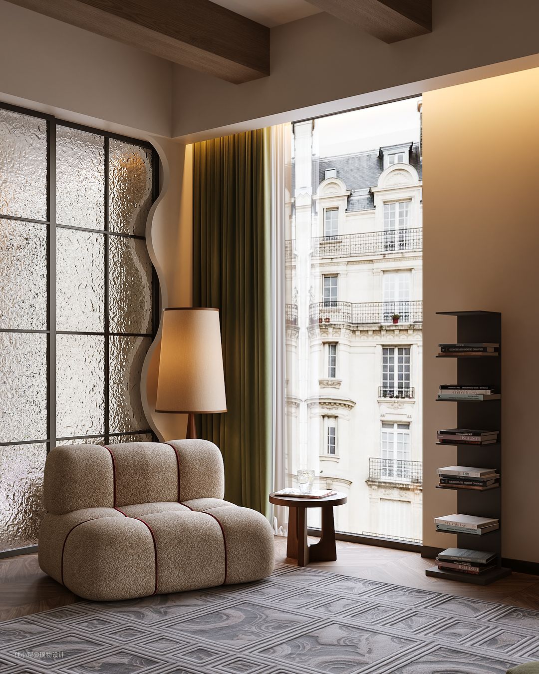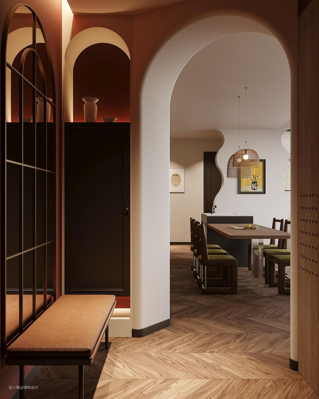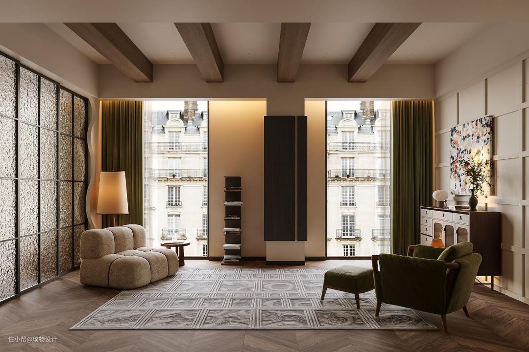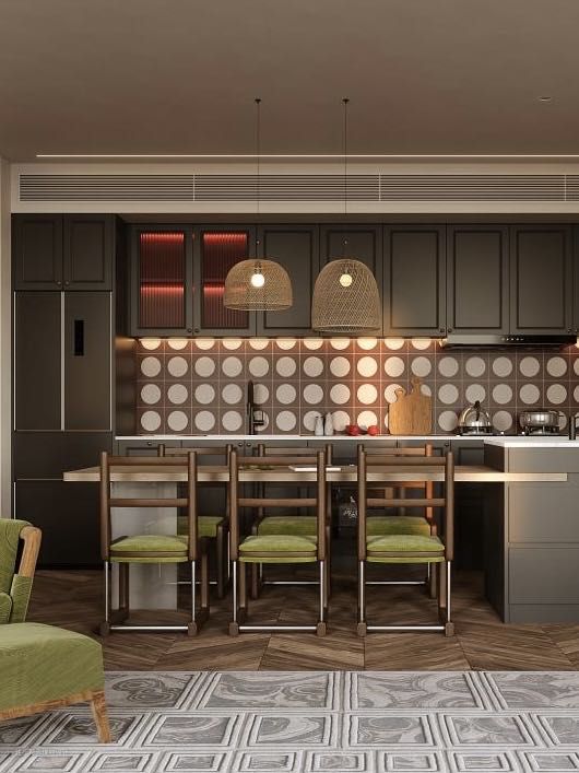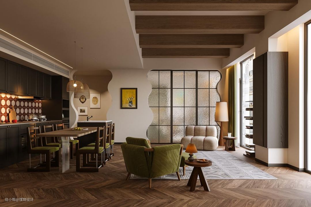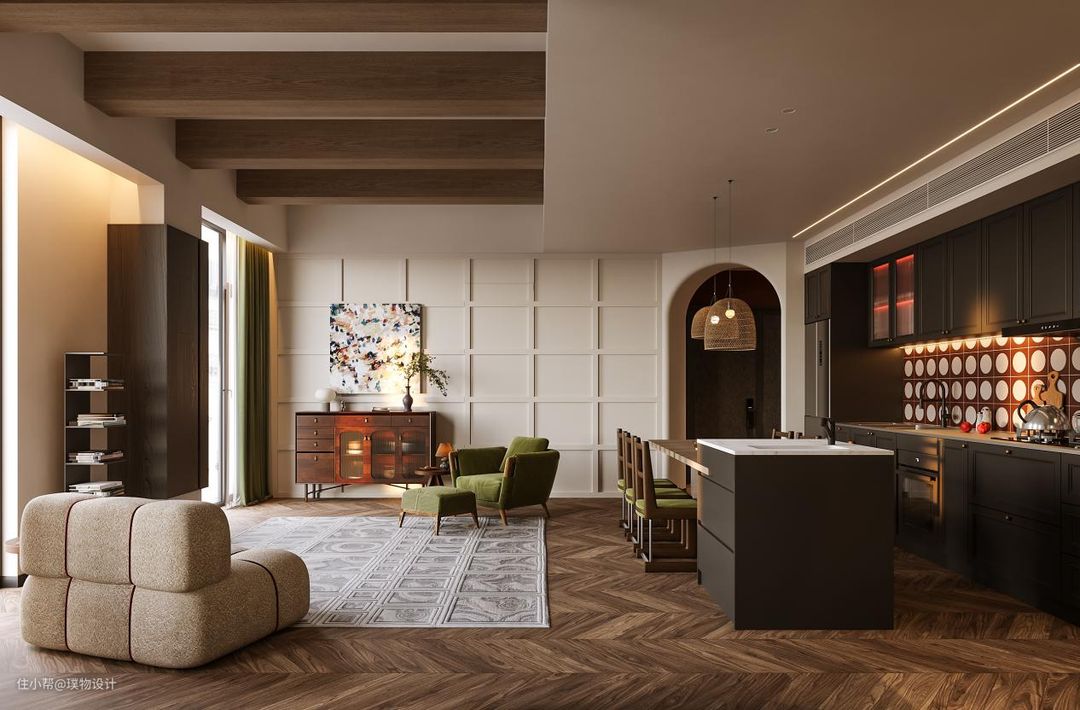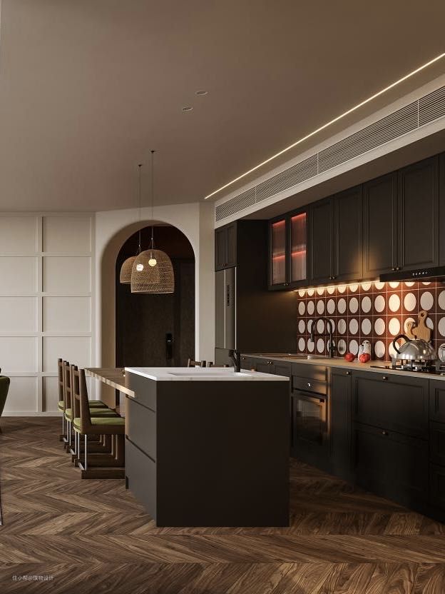 黑色的橱柜搭配白红的墙砖,复古的味道越加浓厚,由于原始房屋的缺陷性,以及客户对于厨房的包容性,我们大胆的将客餐厨放在一块,让空间达到最大化。 我们更换原开发商窗体,增加了新风等设备因此 就有了大面积的落地窗。光线照射到地板砖上, 也将惬意照到室内 黑色木板包柱处理,原本呆板的大柱视线上变得更加轻盈。 我们将长辈卧的房门隐藏在护墙板上,将原本分散的背景墙做的更加整体。开昏黄的灯光,认真做一餐精致的晚餐, 坐在餐桌前细嚼慢咽, 以清静欢喜之心慢度日常,生活需要长久的浪漫娓娓道来。在一个惬意的周末,坐在沙发上喝一杯咖啡悠闲的看着窗外,感受当下的时光。