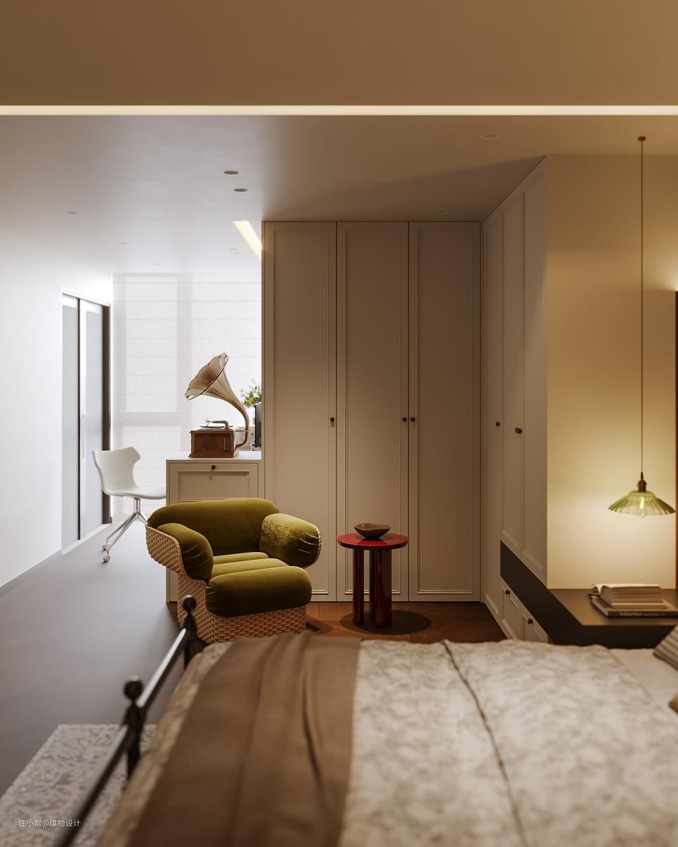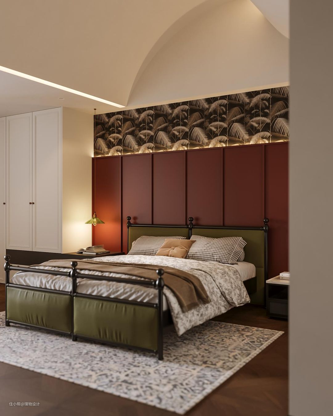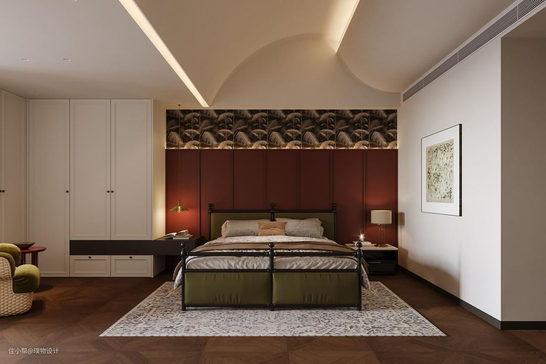 主卧运用了当下最流行的美拉德配色,深红的护墙板与墨绿色的床具搭配没想到如此的精彩。考量到原本房屋的层高结构,将床放置在空间高位处,通过吊顶的圆弧的设计将人的气场控制在内。 大空间的主卧套房连接着开放式的L型衣帽间以及书房区域,互通无碍的同时空间又有序。