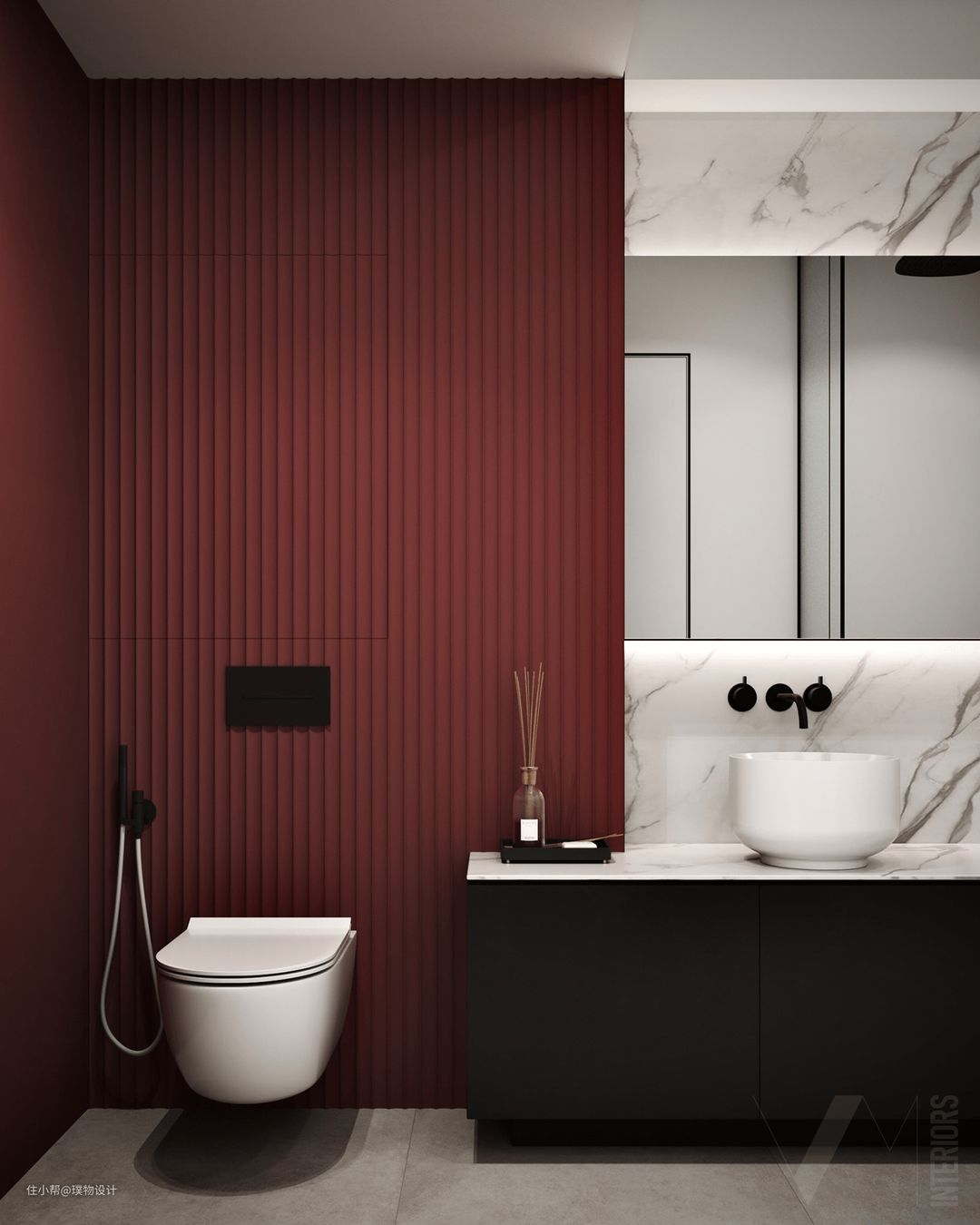 卫生间延续法式复古的情调,采用砖红色防水艺术涂料与白色条形砖结合,清新雅致。