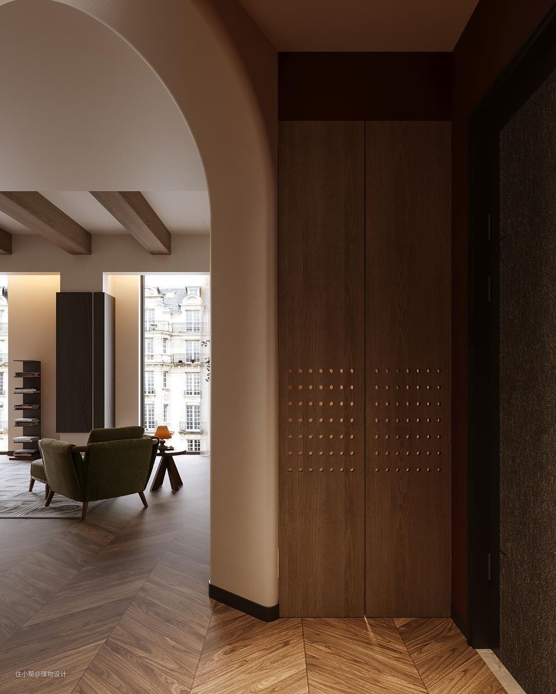 入户子母门的方便不可耳语,迎接主人回家的入户玄关内有乾坤,斜面进客餐厅的圆弧门洞将吧台餐桌框景,回到家看到家人在制作心爱的晚饭,心里瞬间暖暖的,别看玄关小但是功能十分强大,外置的鞋柜用来放置偶尔来访的客人,右手边鞋帽间用来放置巨多的储物。右手边的镜子可以在出门前整理一下自己的着装。 考虑到鞋帽间的通风性,将门板做了洞洞板的形式,夜晚的光线从内穿射出来形成别样的光影。