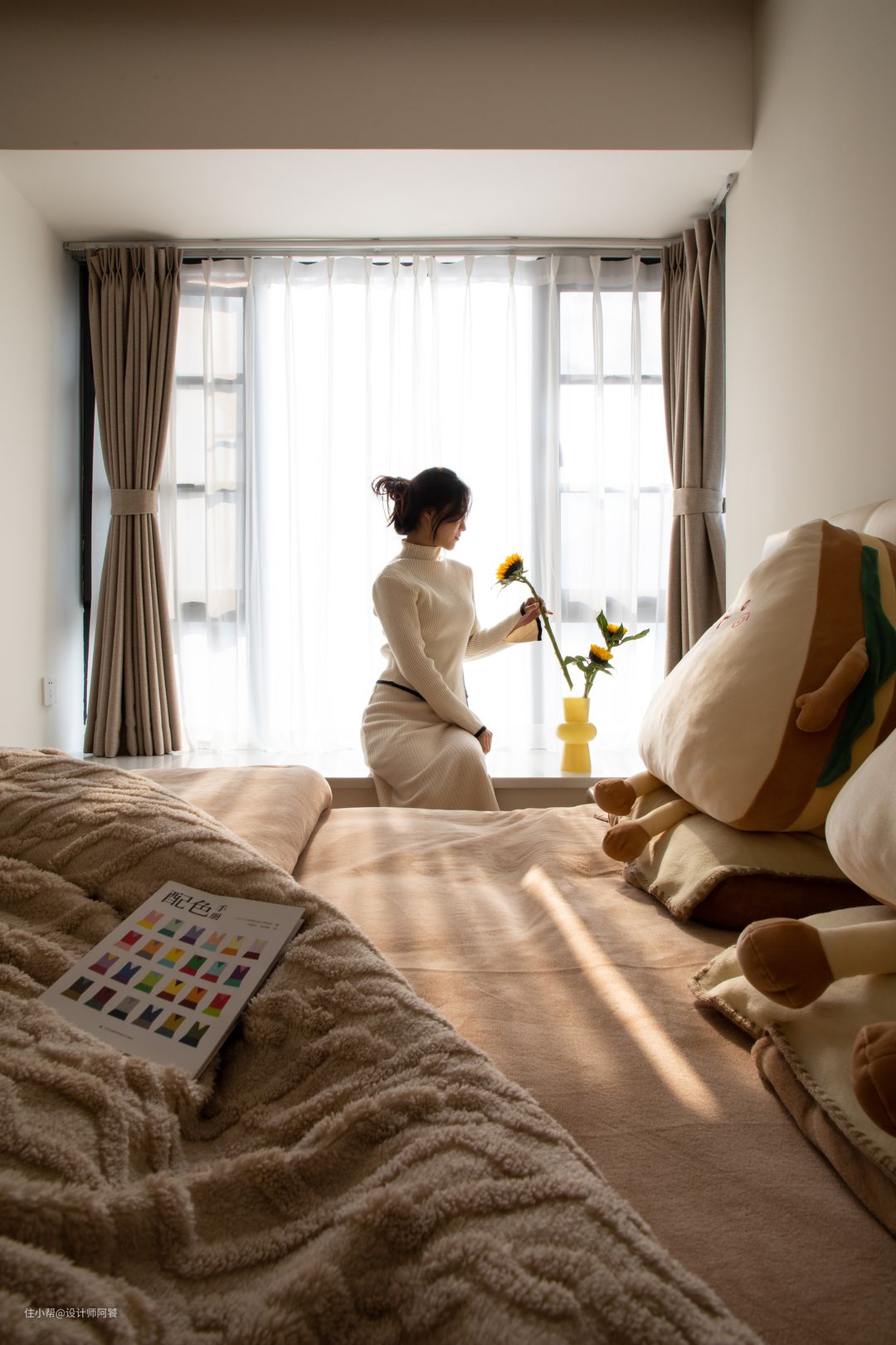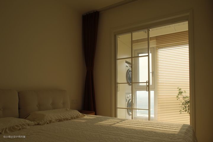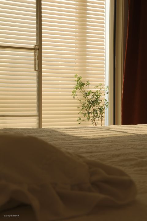 主色奶油色,原木色做点缀,卧室更有温馨感 ✨ ◽全屋到顶乳胶漆(奶油白) ◽推拉门不变,设计白色格子玻璃门 ◽选用橙色绒布遮光窗帘,布帘➕纱帘,氛围感满满