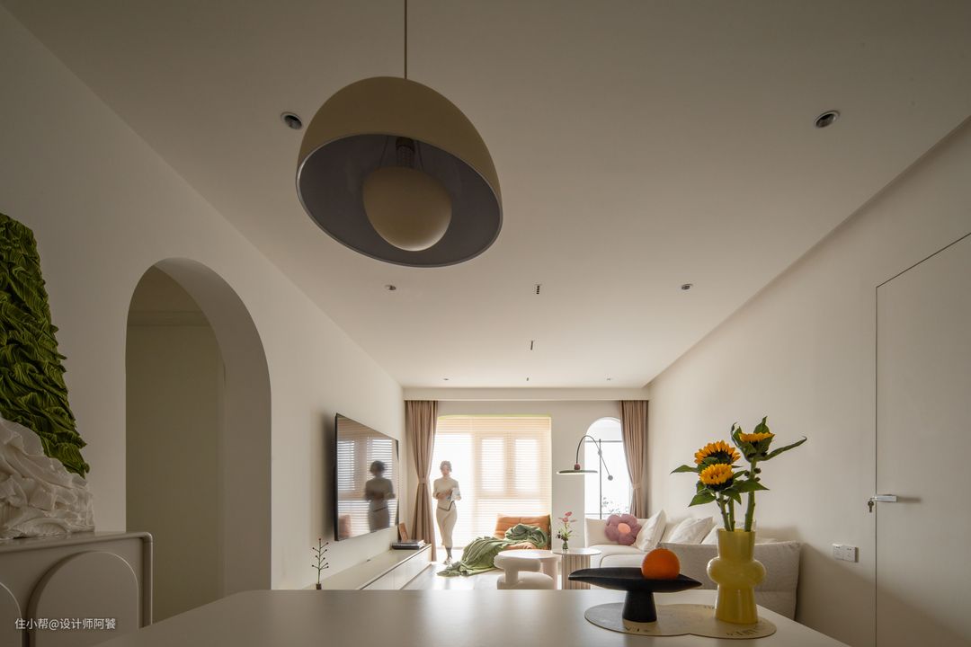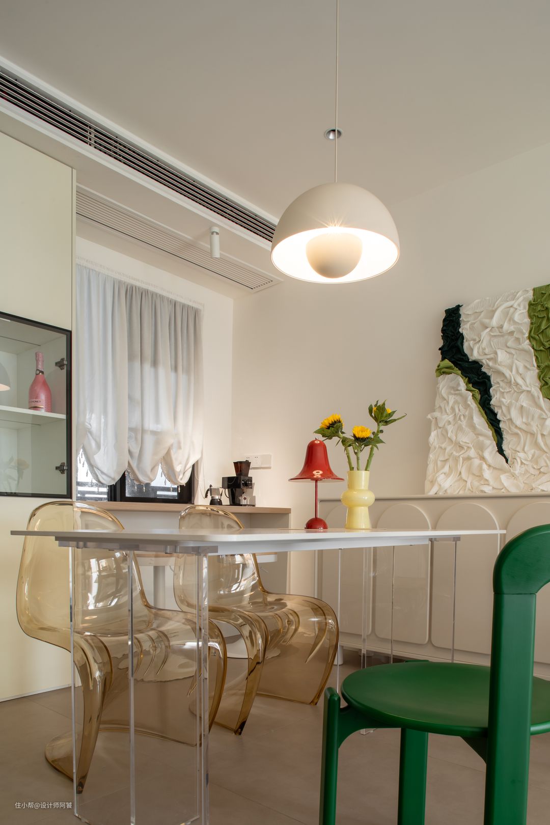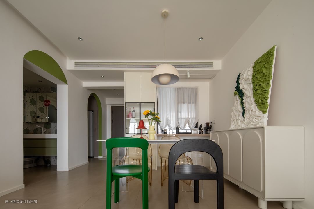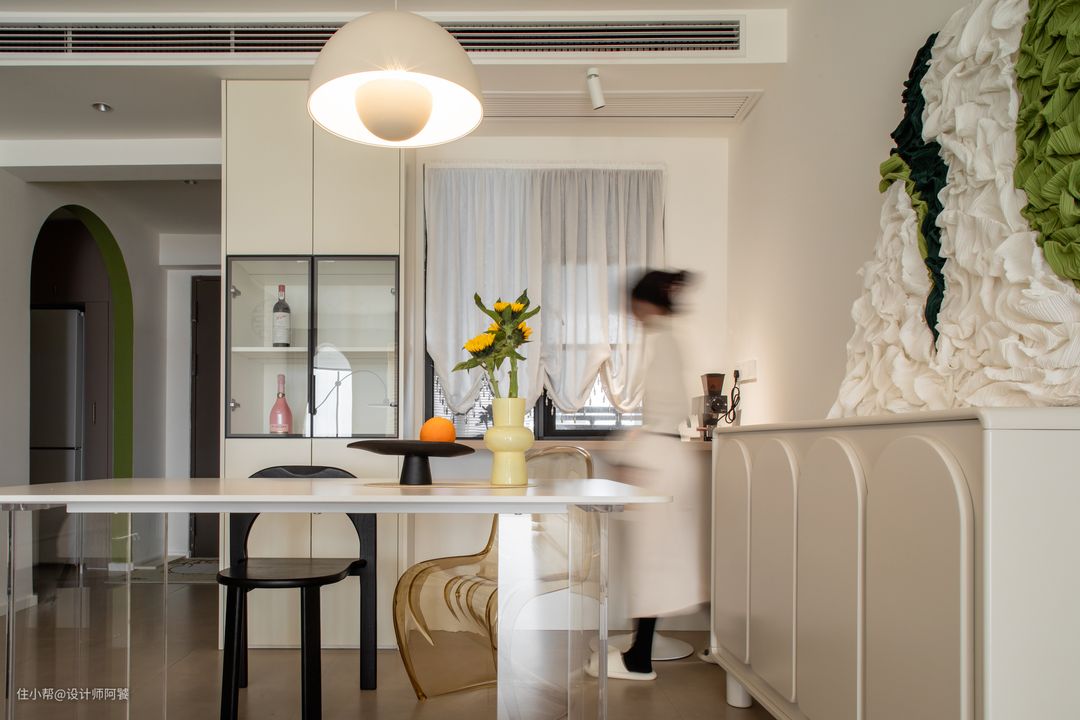 入户见厅的户型,定制一组隔断柜之后,剩余空间做了客餐厅一体化设计,整体显得更加宽敞、通透。 餐桌选用透明亚克力餐桌腿搭配白色岩板,餐椅设计透明+色彩造型感椅子,空间视觉感得以延申~ 餐厅设计酒柜、吧台——储酒与烘焙咖啡有了位置摆放。 灯光氛围方面设计单独小吊灯搭配射灯,让餐厅也有灵动的“白月光”气质🌙