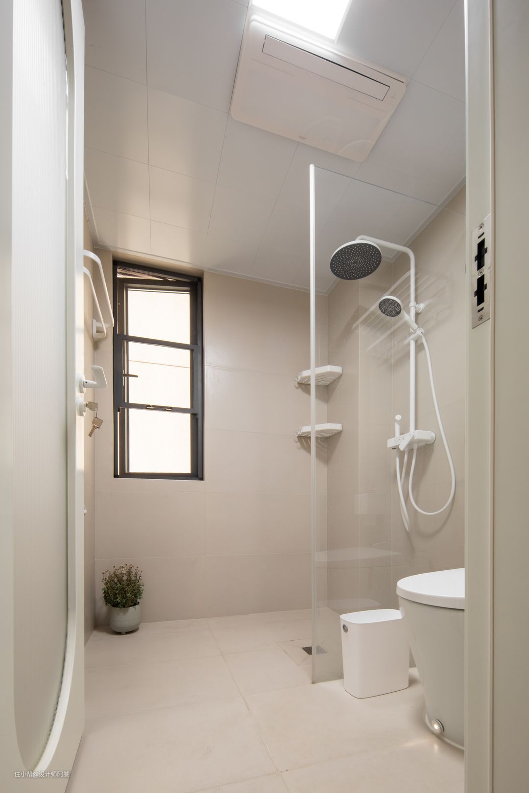 卫生间设计三分离,干净而极又纯粹 干区墙面设计“草绿”色点缀,与客厅相呼应 墙地面瓷砖选用奶油色柔光砖,让空间提升层次和温暖🤎 在卫生间留出了比较舒服的淋浴和马桶位置后,将浴室柜台面尽可能做大