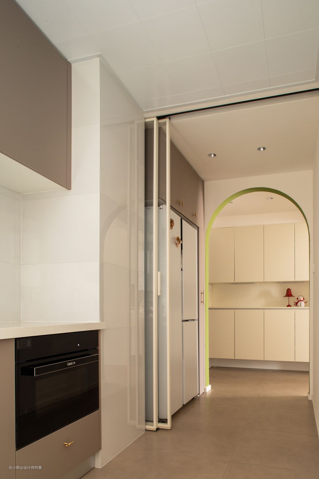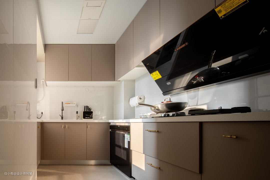 整个厨房呈现的是一个U字的格局,置物收纳合理布局,井然有序。 整体运用了浅咖色的柜体,搭配超白石英石,柔软又高级。 吊柜没有做拉手,地柜设计金色拉手,强调空间的开阔和简约,十分耐看~ 地面做的微水泥瓷砖,通铺视觉效果更好,日常打理也很方便。 咖🤎白⚪️灰◻️搭配