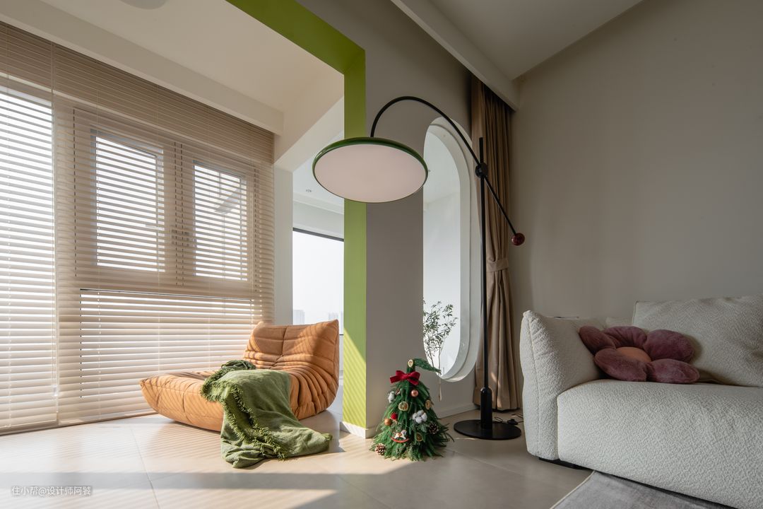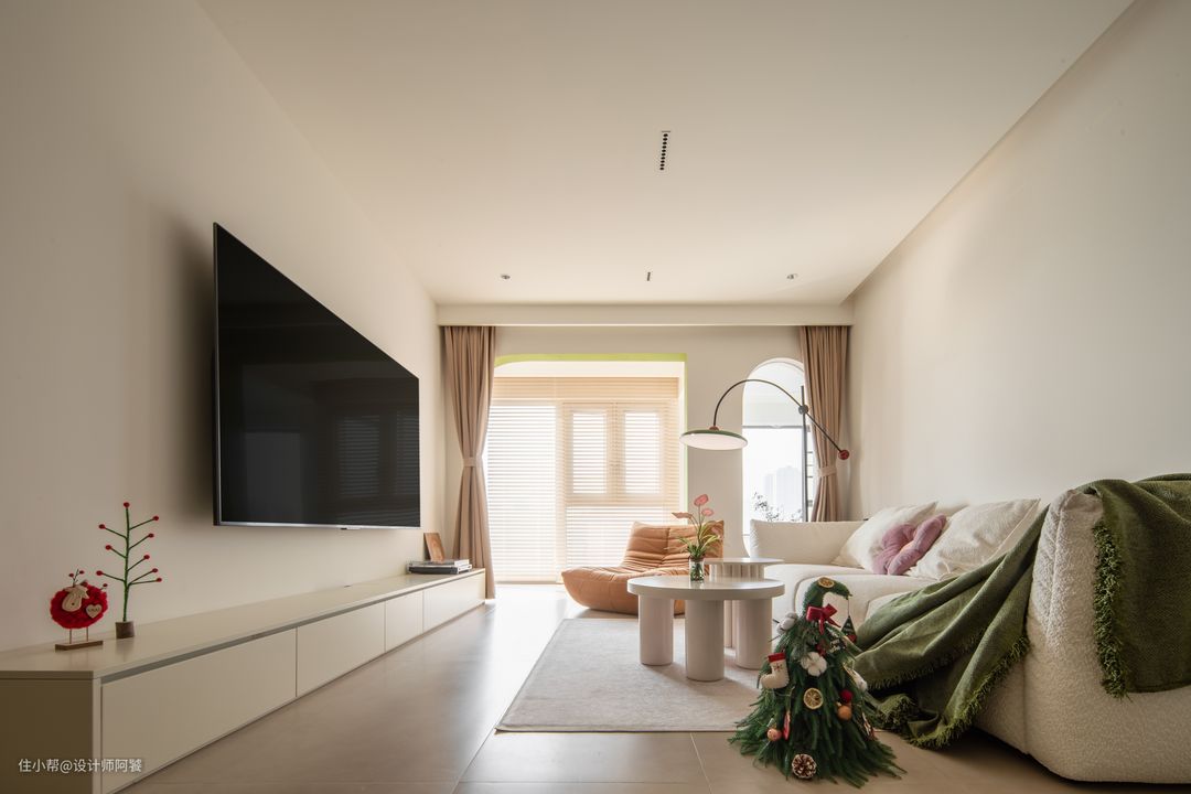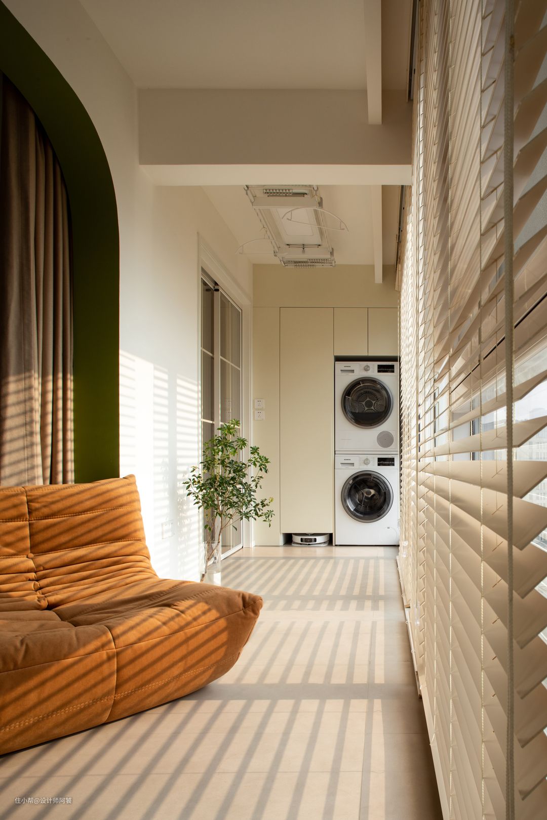 客厅将阳台融入室内,扩大可用面积 视觉上看起来更加通透显大 !! 阳台门洞设计弧形垭口,一侧设计弧形玻璃造型墙,软装窗帘选用木制百叶帘❤️ 阳台设计洗衣柜+储物柜 ,空间休闲、晒衣一体化!!!
