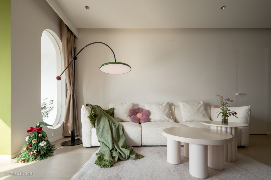 空间通透干净,不执着于过多的装饰, 弧形造型+线性灯,简约的设计感和层次感, 低饱和度的色彩搭配草绿色的单独跳色,给人温馨舒适的感觉, 同时还是可以上镜出片的ins治愈系屋宅