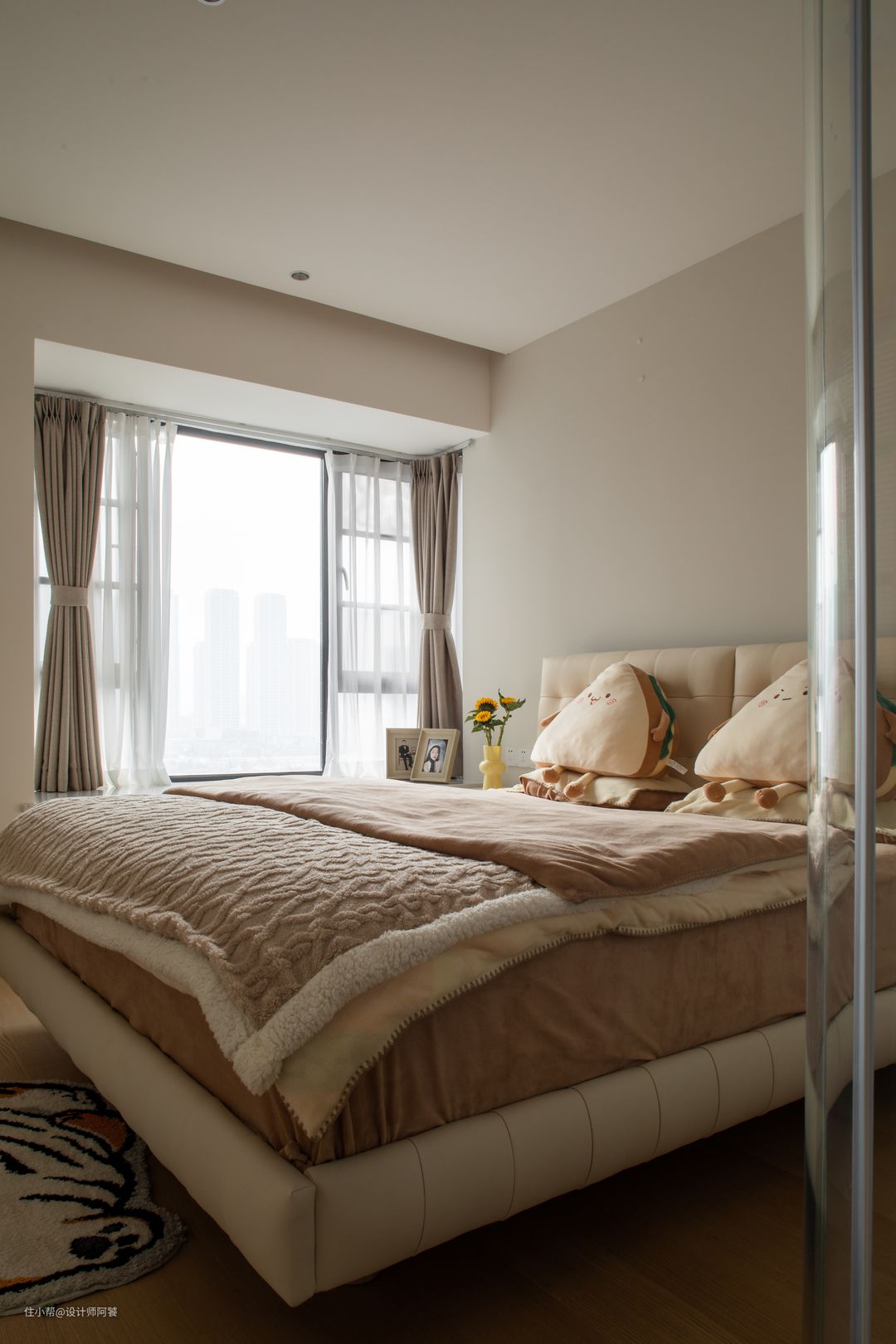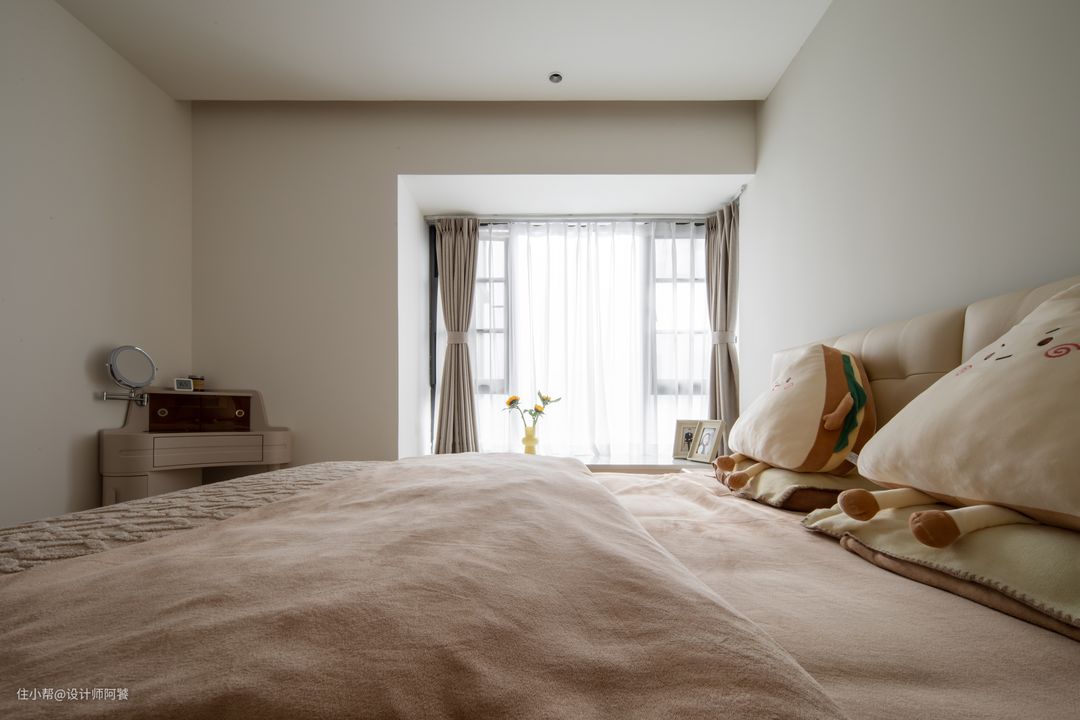卧室的颜色偏奶茶色,选择了一张同色系的悬浮床🛏️,看起来超搭~ 床的尺寸是1.8*2m的 环抱式的床头设计感十足,高级又轻奢, 铺上浅咖色的四件套,一整个温馨感满满,真的太爱❤️了~ 全透明主卧卫生间,空间增加很多倍呀。淋浴和马桶分区做玻璃门,干湿分离防臭~ 最喜欢这个大洗脸台旁边的纱帘,氛围感拉满~~ 主卧卫生间白色墙地一体砖好特别啊!