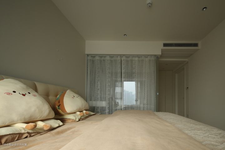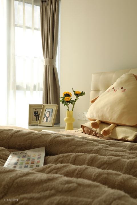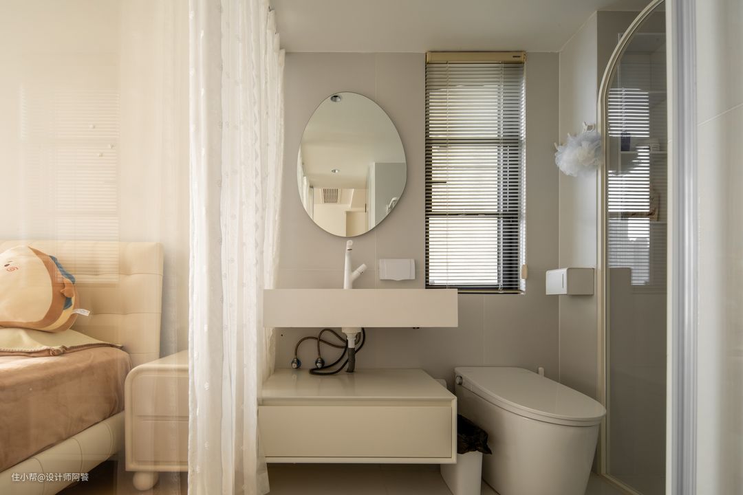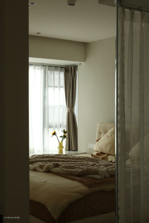 卧室的颜色偏奶茶色,选择了一张同色系的悬浮床🛏️,看起来超搭~ 床的尺寸是1.8*2m的 环抱式的床头设计感十足,高级又轻奢, 铺上浅咖色的四件套,一整个温馨感满满,真的太爱❤️了~ 全透明主卧卫生间,空间增加很多倍呀。淋浴和马桶分区做玻璃门,干湿分离防臭~ 最喜欢这个大洗脸台旁边的纱帘,氛围感拉满~~ 主卧卫生间白色墙地一体砖好特别啊!