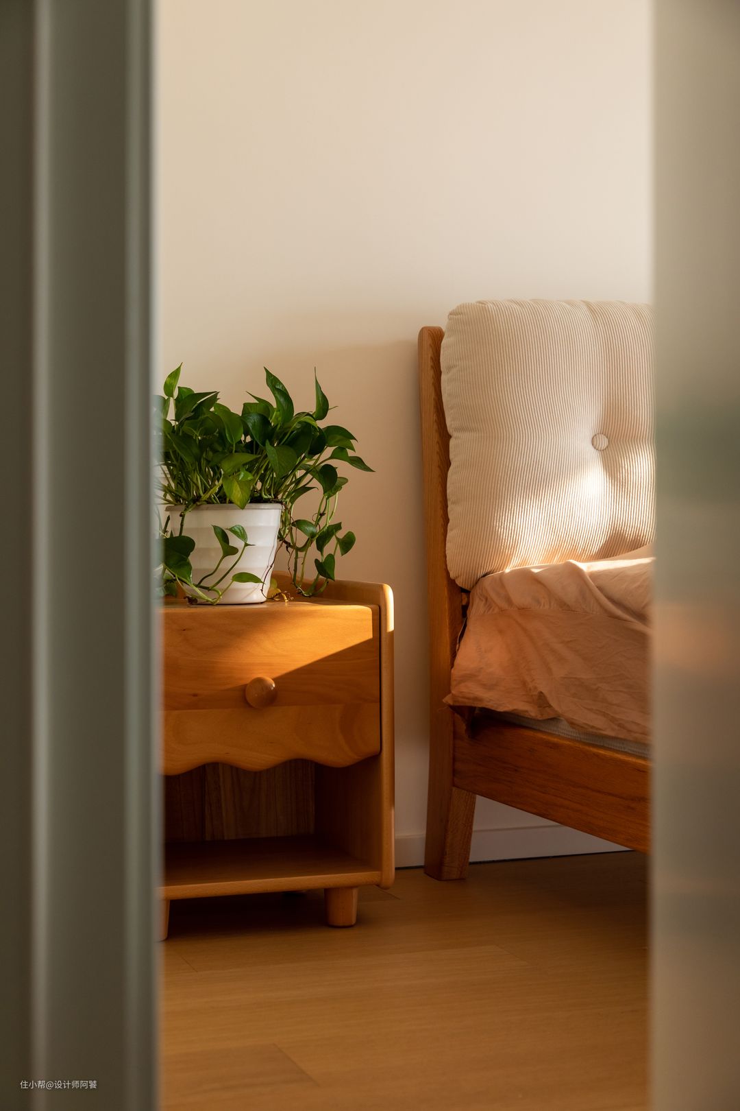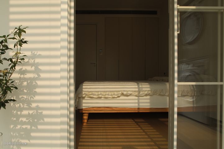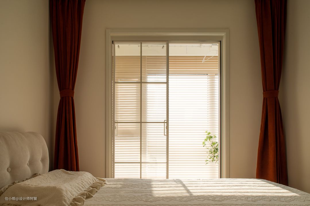 主色奶油色,原木色做点缀,卧室更有温馨感 ✨ ◽全屋到顶乳胶漆(奶油白) ◽推拉门不变,设计白色格子玻璃门 ◽选用橙色绒布遮光窗帘,布帘➕纱帘,氛围感满满