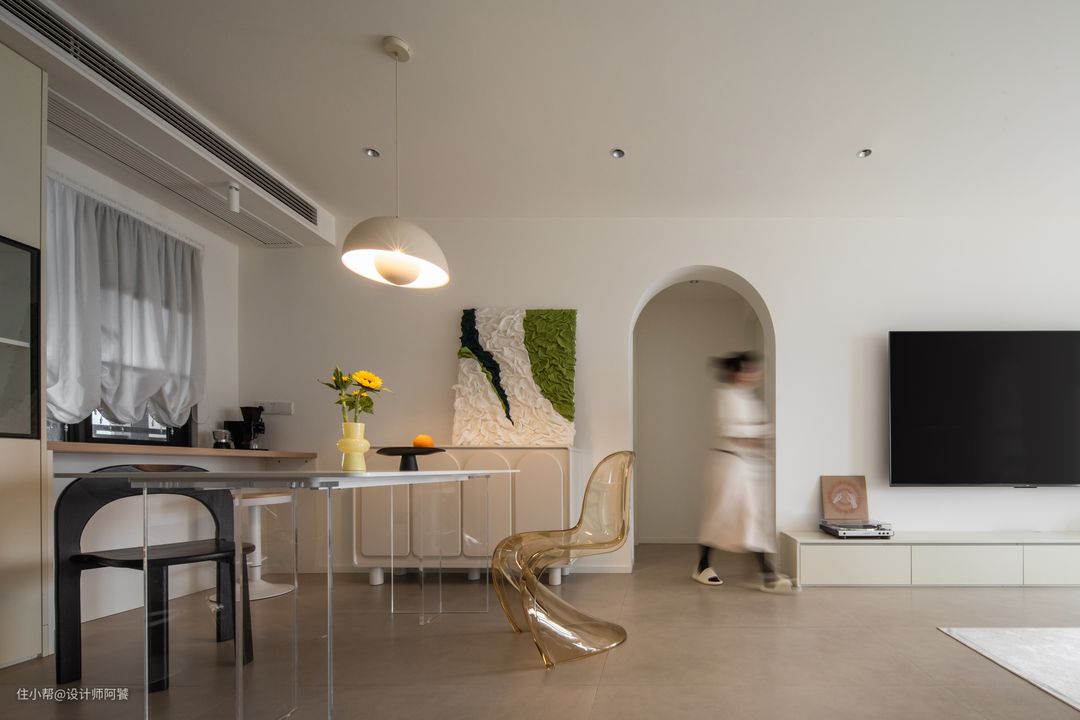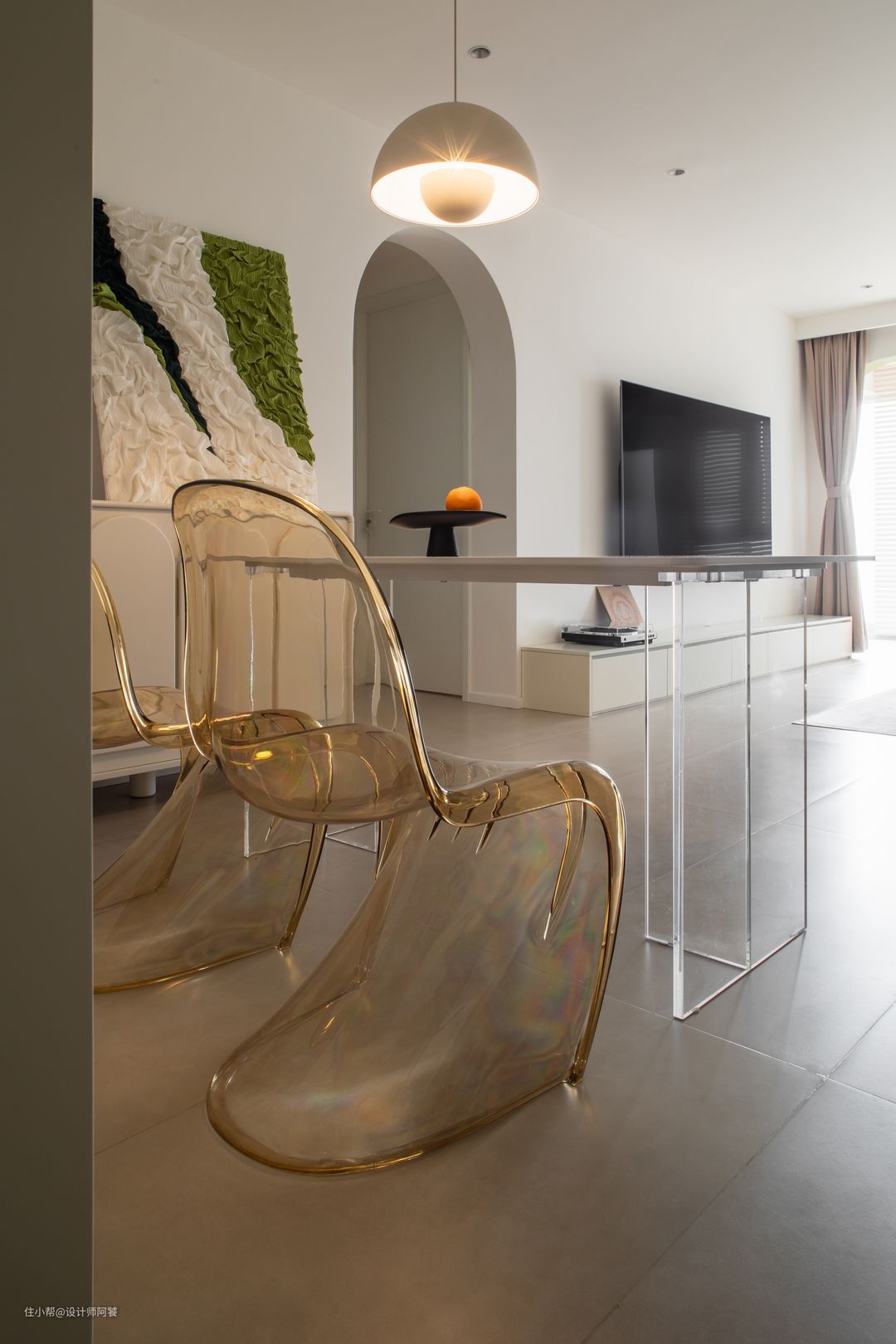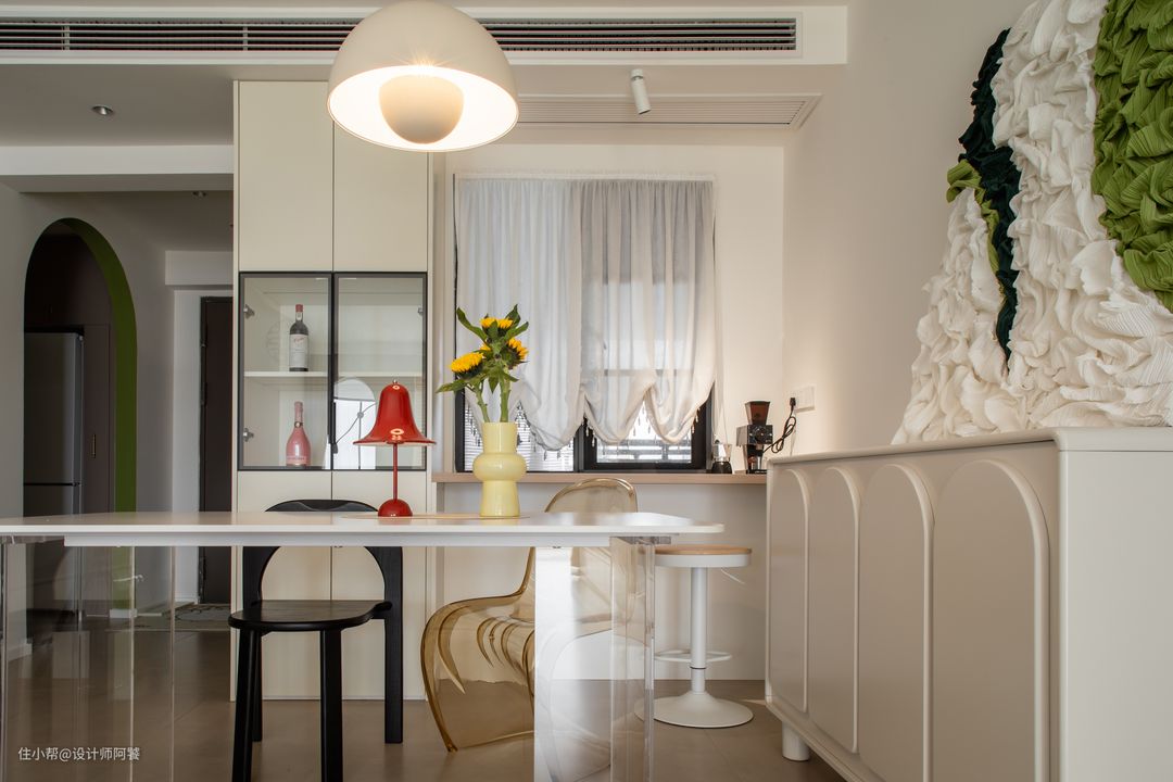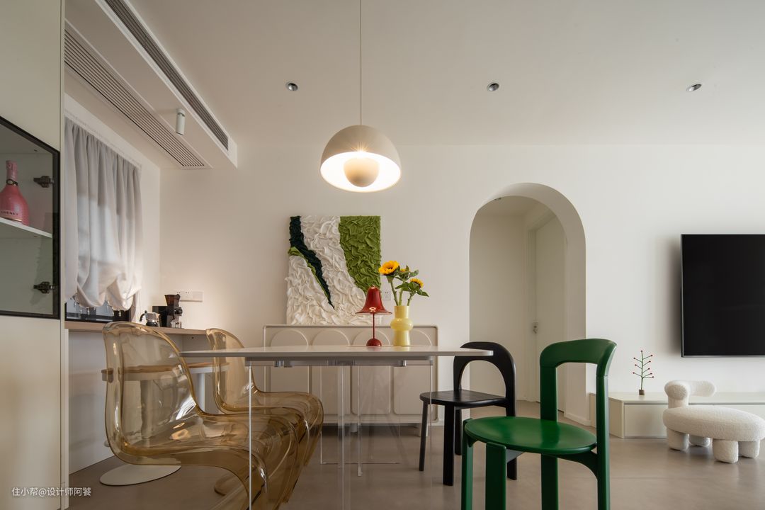 入户见厅的户型,定制一组隔断柜之后,剩余空间做了客餐厅一体化设计,整体显得更加宽敞、通透。 餐桌选用透明亚克力餐桌腿搭配白色岩板,餐椅设计透明+色彩造型感椅子,空间视觉感得以延申~ 餐厅设计酒柜、吧台——储酒与烘焙咖啡有了位置摆放。 灯光氛围方面设计单独小吊灯搭配射灯,让餐厅也有灵动的“白月光”气质🌙