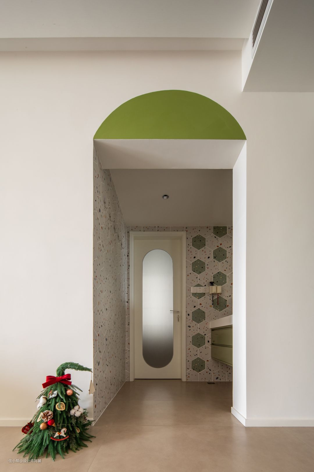 空间通透干净,不执着于过多的装饰, 弧形造型+线性灯,简约的设计感和层次感, 低饱和度的色彩搭配草绿色的单独跳色,给人温馨舒适的感觉, 同时还是可以上镜出片的ins治愈系屋宅