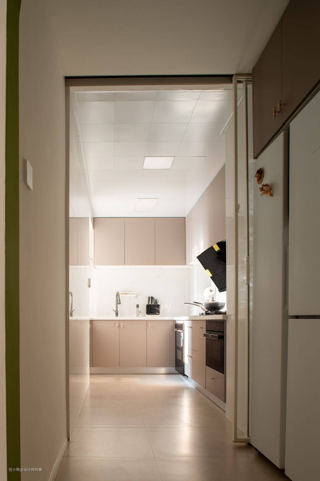 整个厨房呈现的是一个U字的格局,置物收纳合理布局,井然有序。 整体运用了浅咖色的柜体,搭配超白石英石,柔软又高级。 吊柜没有做拉手,地柜设计金色拉手,强调空间的开阔和简约,十分耐看~ 地面做的微水泥瓷砖,通铺视觉效果更好,日常打理也很方便。 咖🤎白⚪️灰◻️搭配