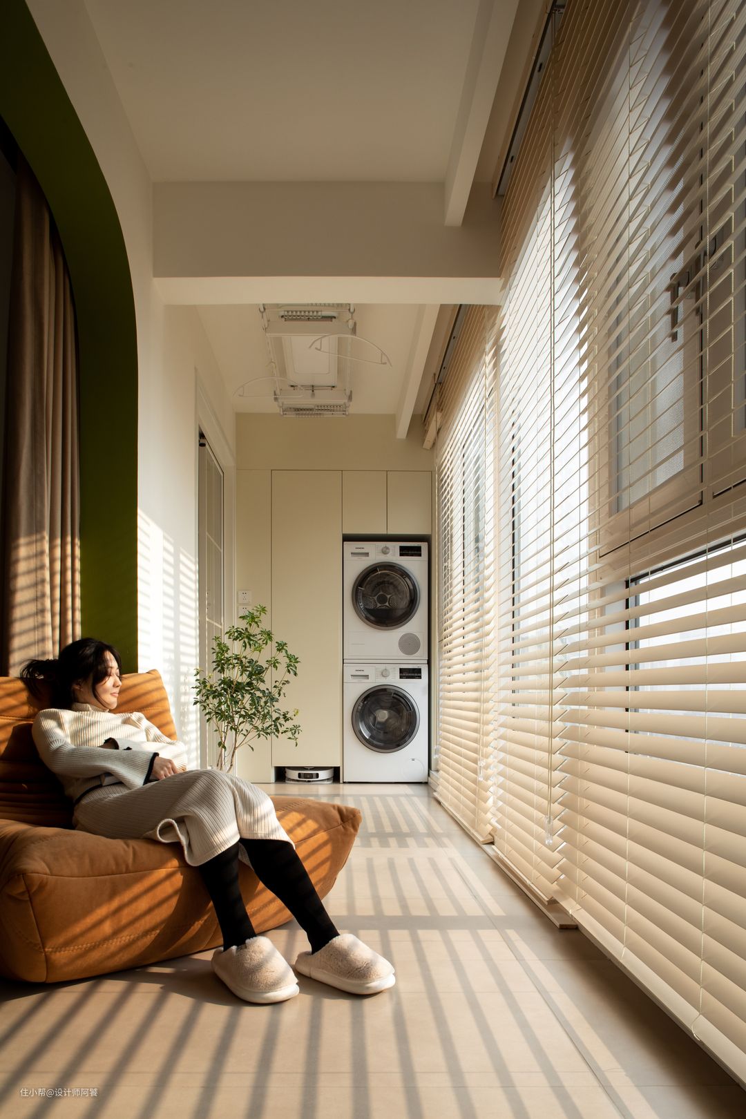 客厅将阳台融入室内,扩大可用面积 视觉上看起来更加通透显大 !! 阳台门洞设计弧形垭口,一侧设计弧形玻璃造型墙,软装窗帘选用木制百叶帘❤️ 阳台设计洗衣柜+储物柜 ,空间休闲、晒衣一体化!!!