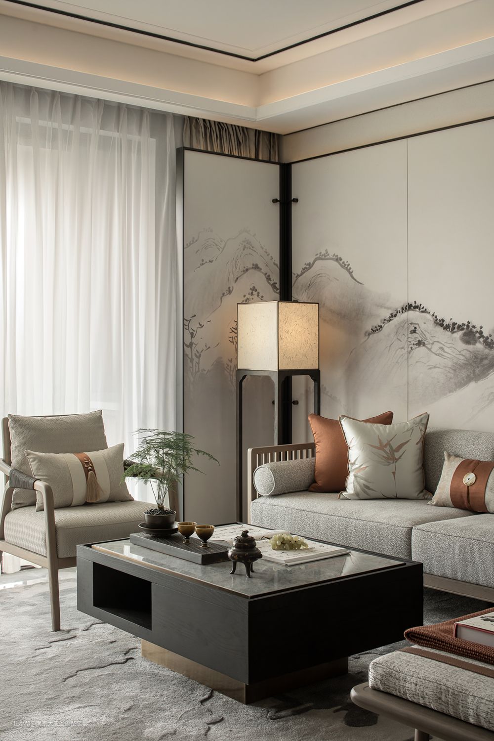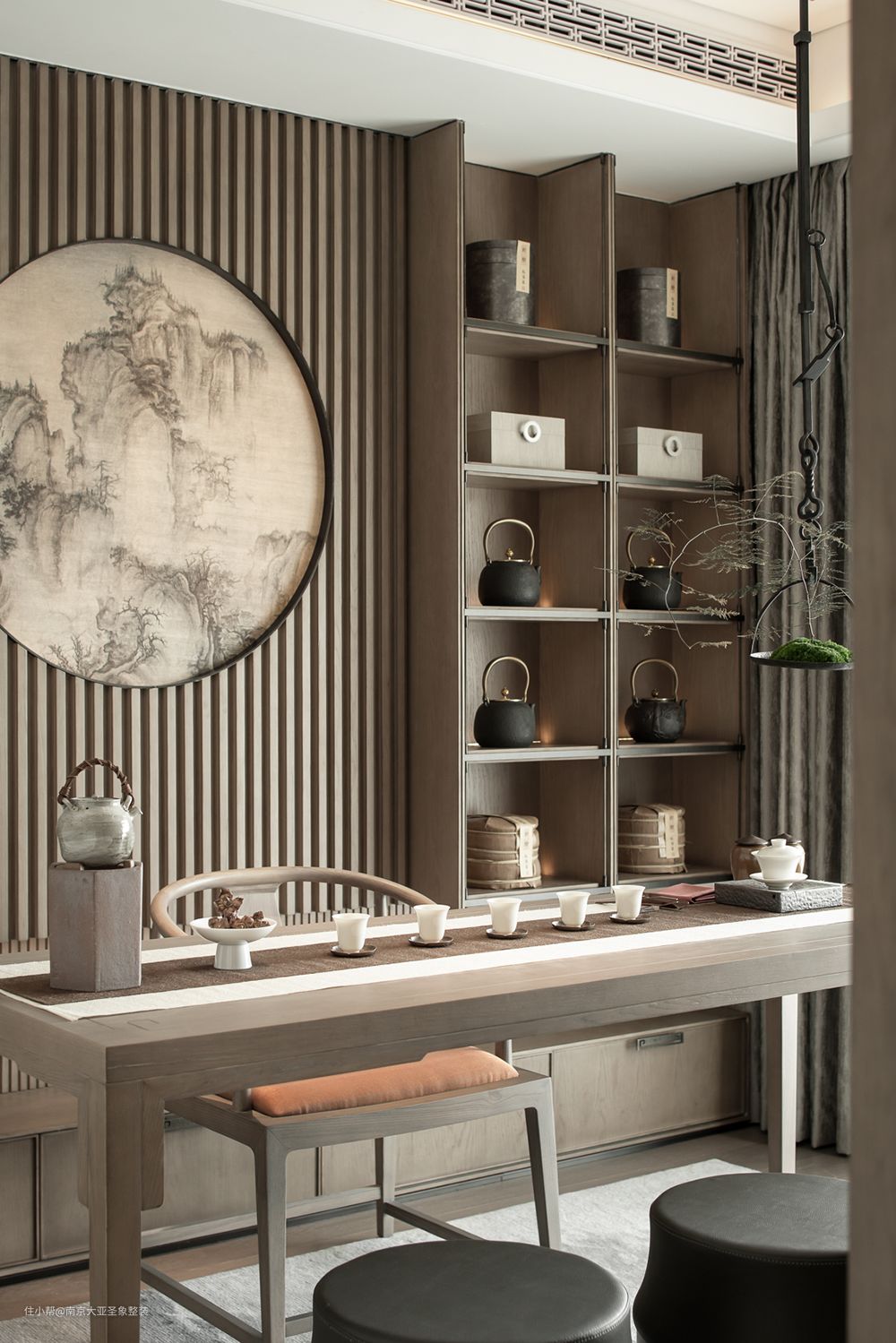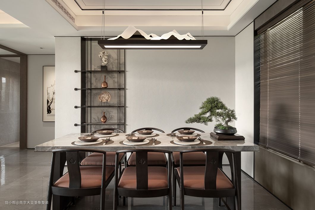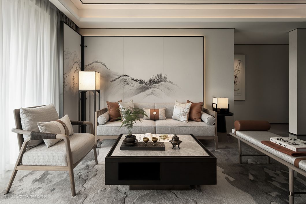 整体开放式布局 通透感 集会客、观影、用餐、休闲于一体 空间开阔大气 温馨静谧 越看越有韵味 你说高级?处处都是风景 没有过多复杂的装饰 木制元素的大量运用 利用框景来增加通透性 一杯清茶就好 与家人坐下慢品