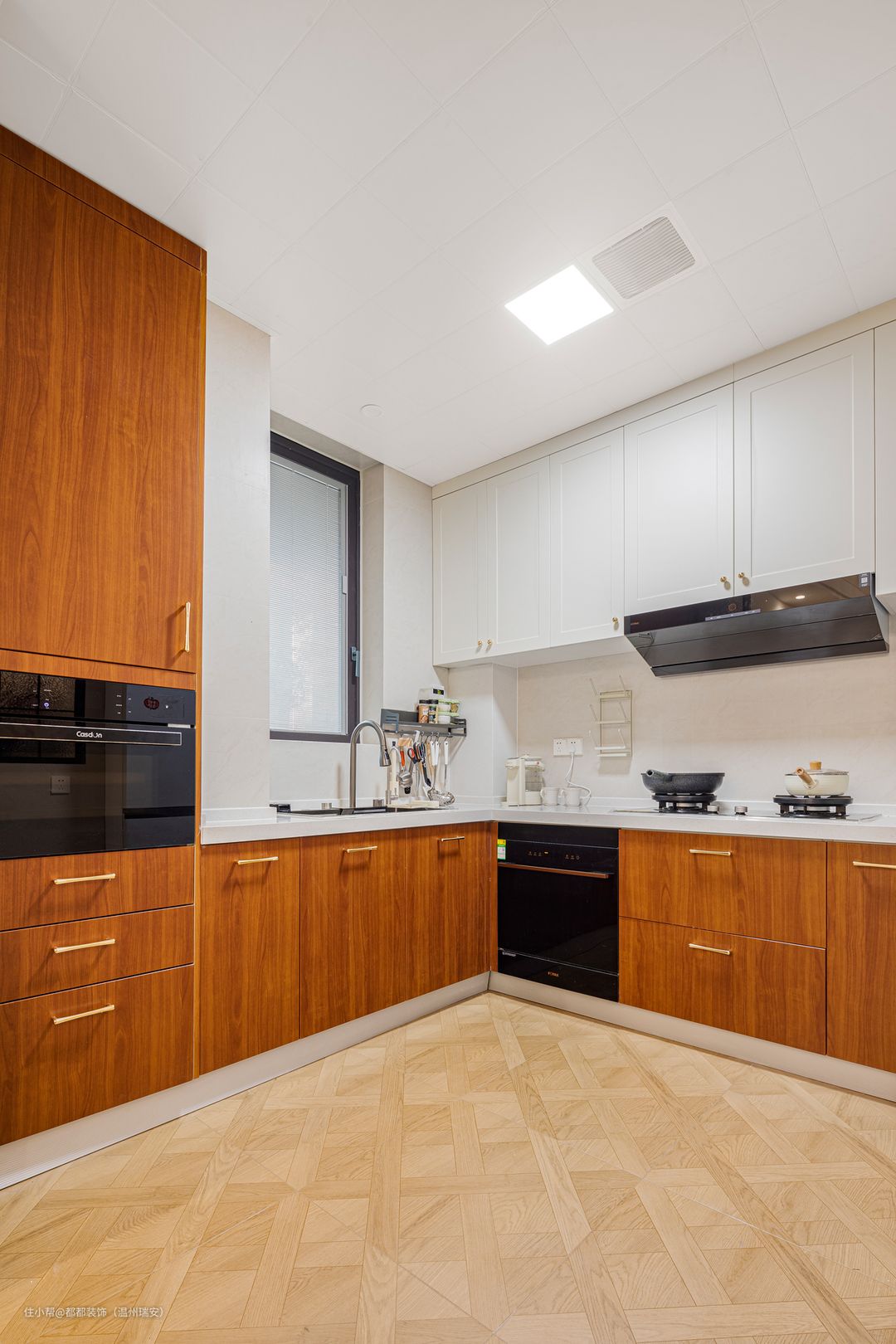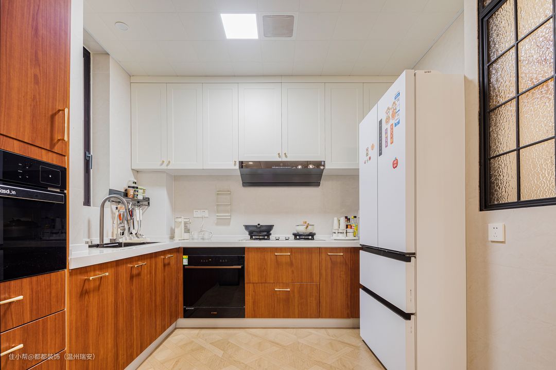 统一鹅黄色瓷砖铺贴,高柜与地柜统一深木色相结合,吊柜纯白色视觉更简洁,对比搭配空间更清爽温馨。嵌入式的家电设计不仅不占用空间,也使得厨房整体线条更加流畅。