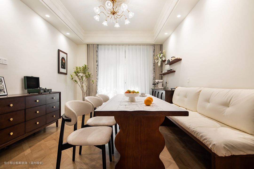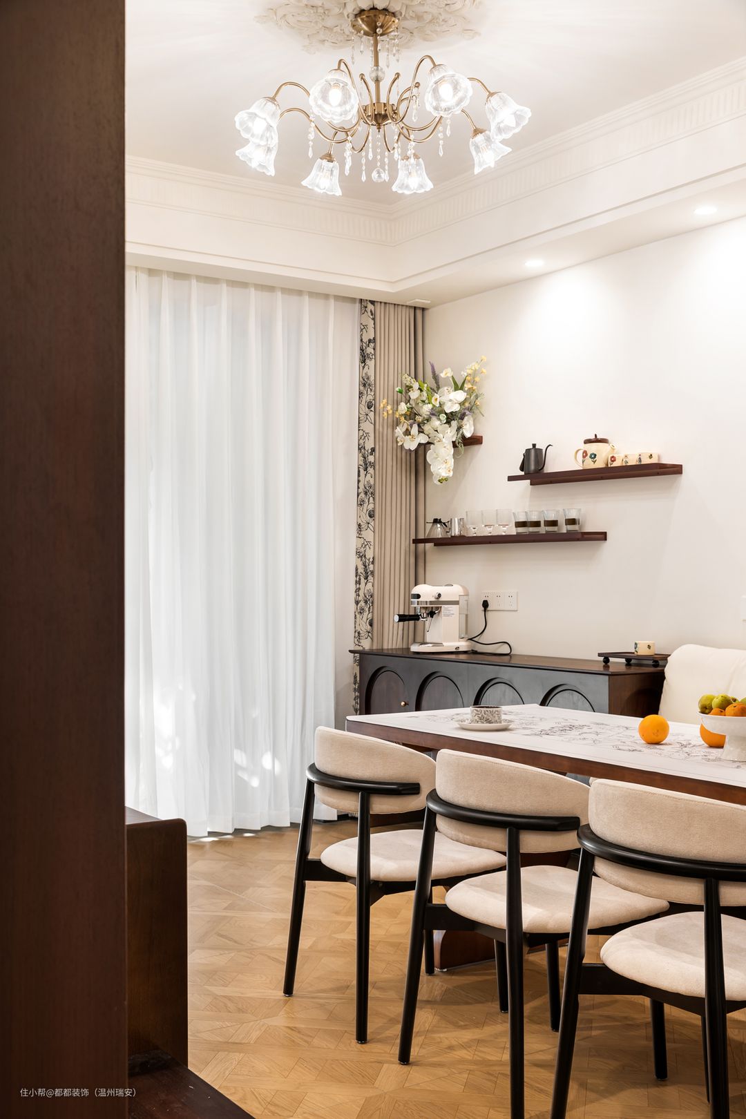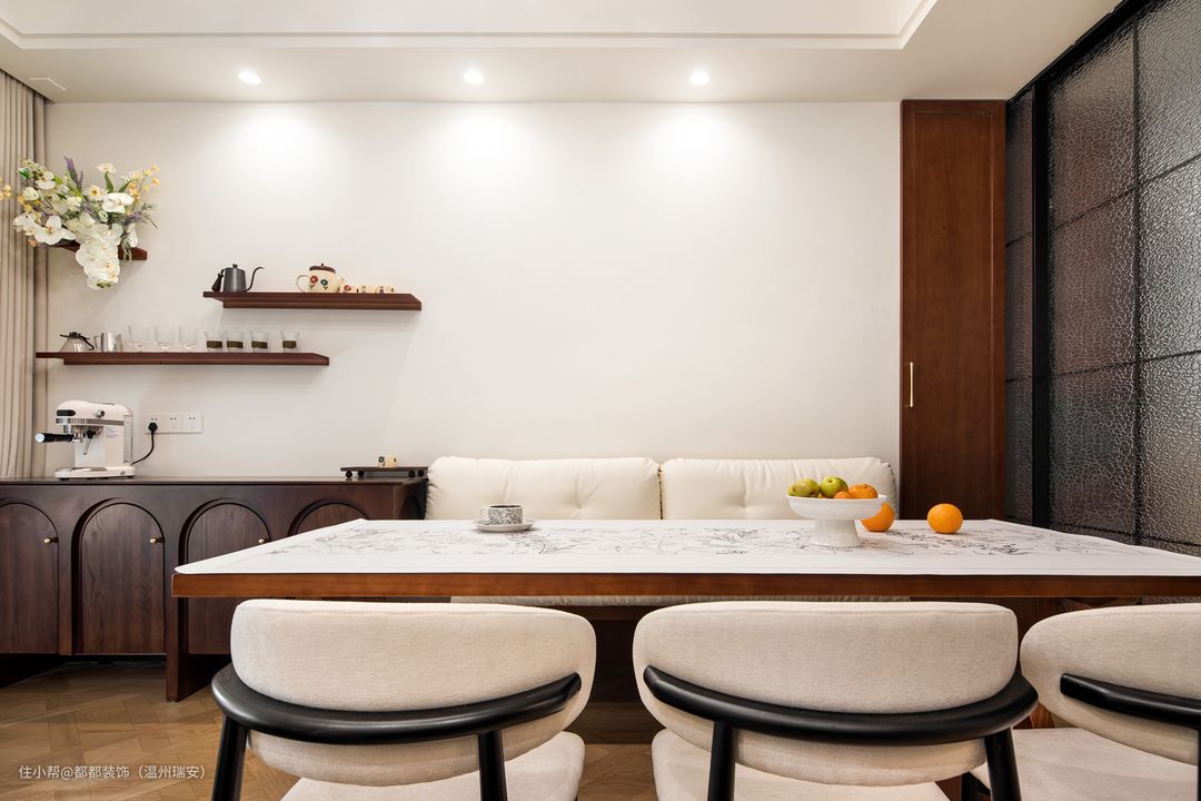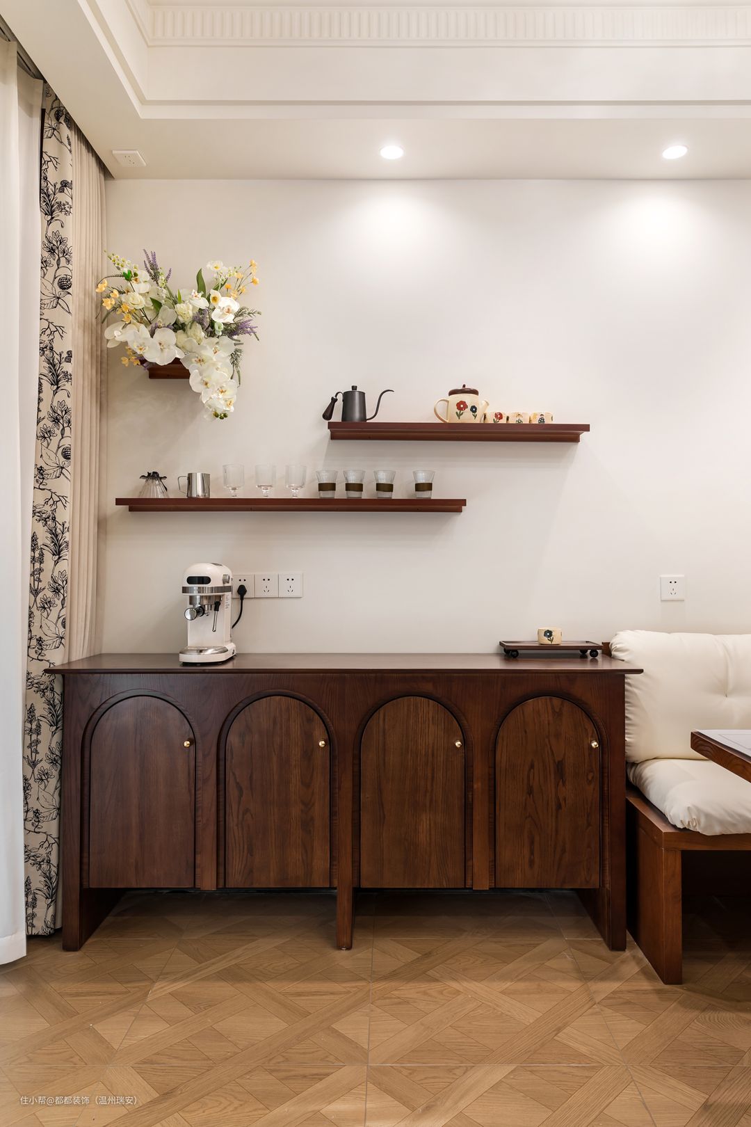 一字型的卡座餐椅设计,利更加节省空间,然后再横向平行摆放上餐桌餐椅,空间条理划分清晰。餐厅两侧均卡布置深木色餐边柜,轻松收纳物品。 墙壁定制隔板,摆放日常所用杯具和物品,再加上鲜花和画室的点缀,让整个空间更加温馨浪漫。