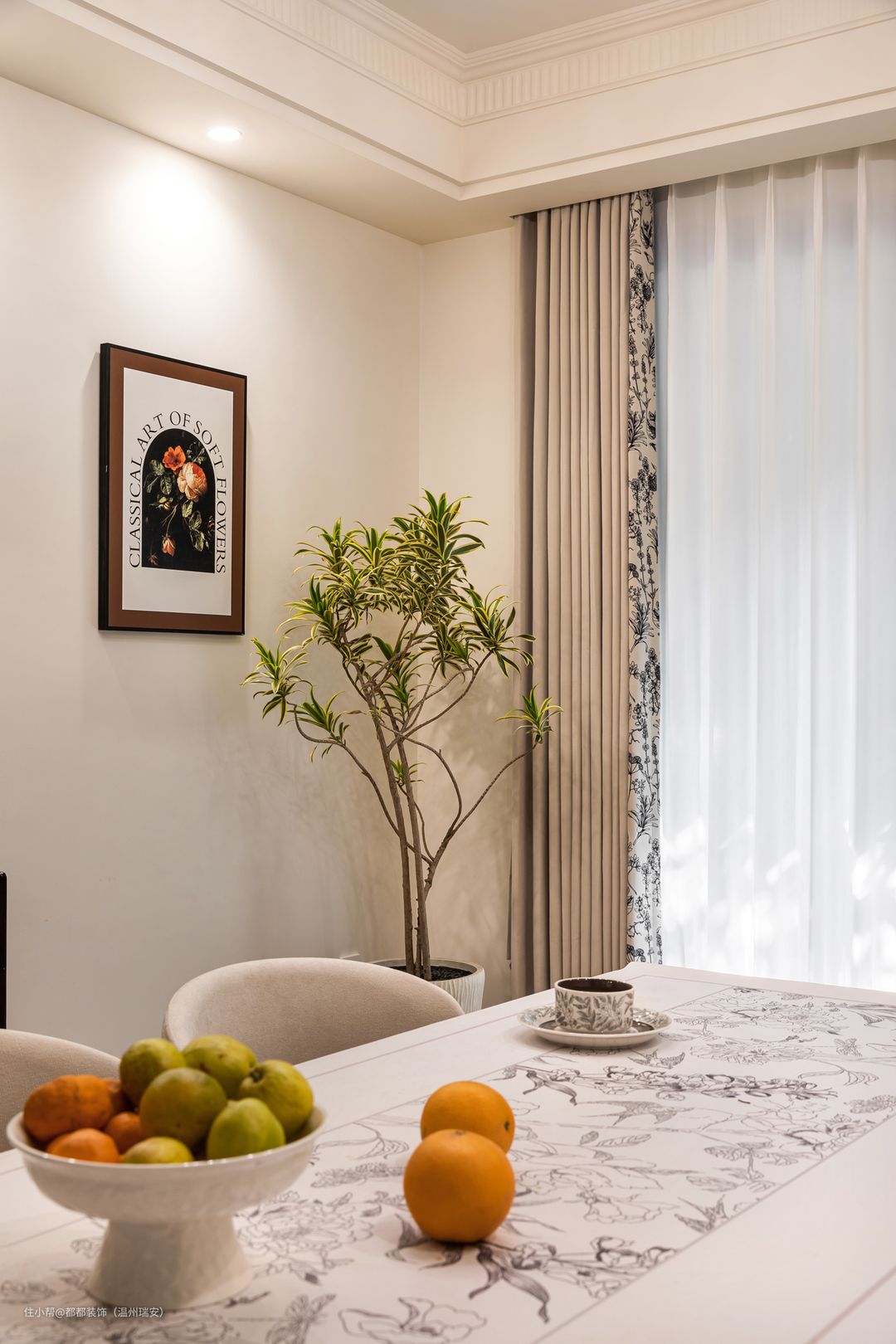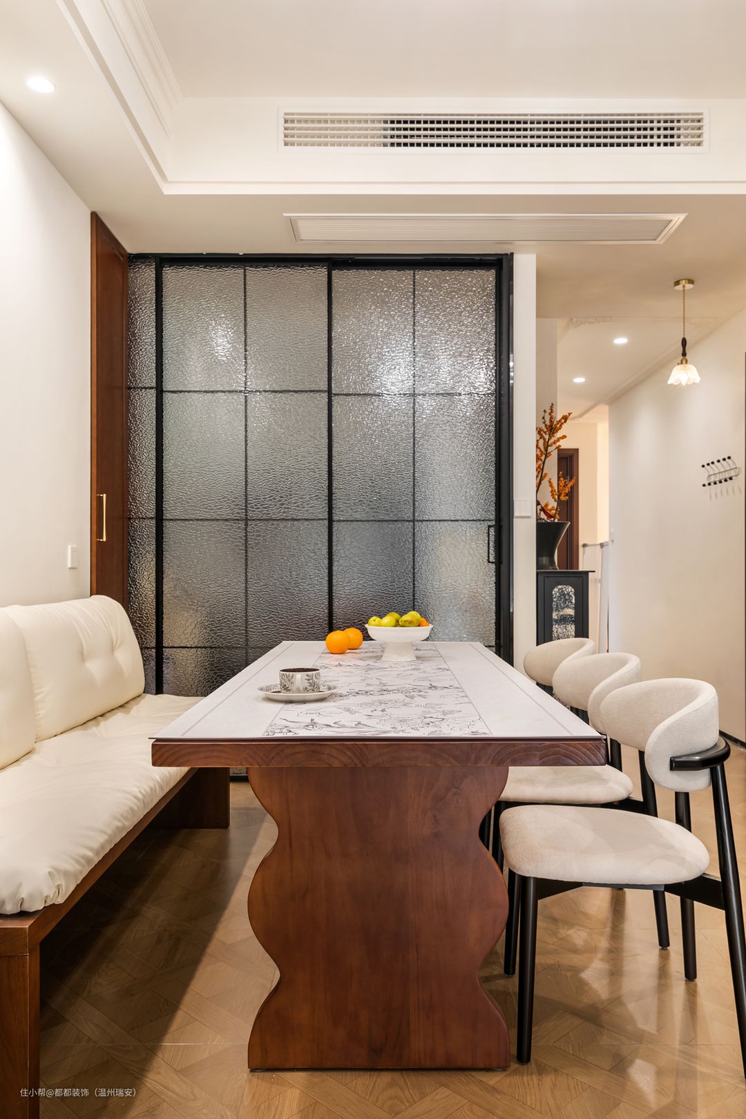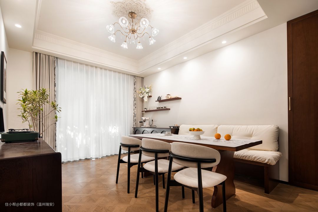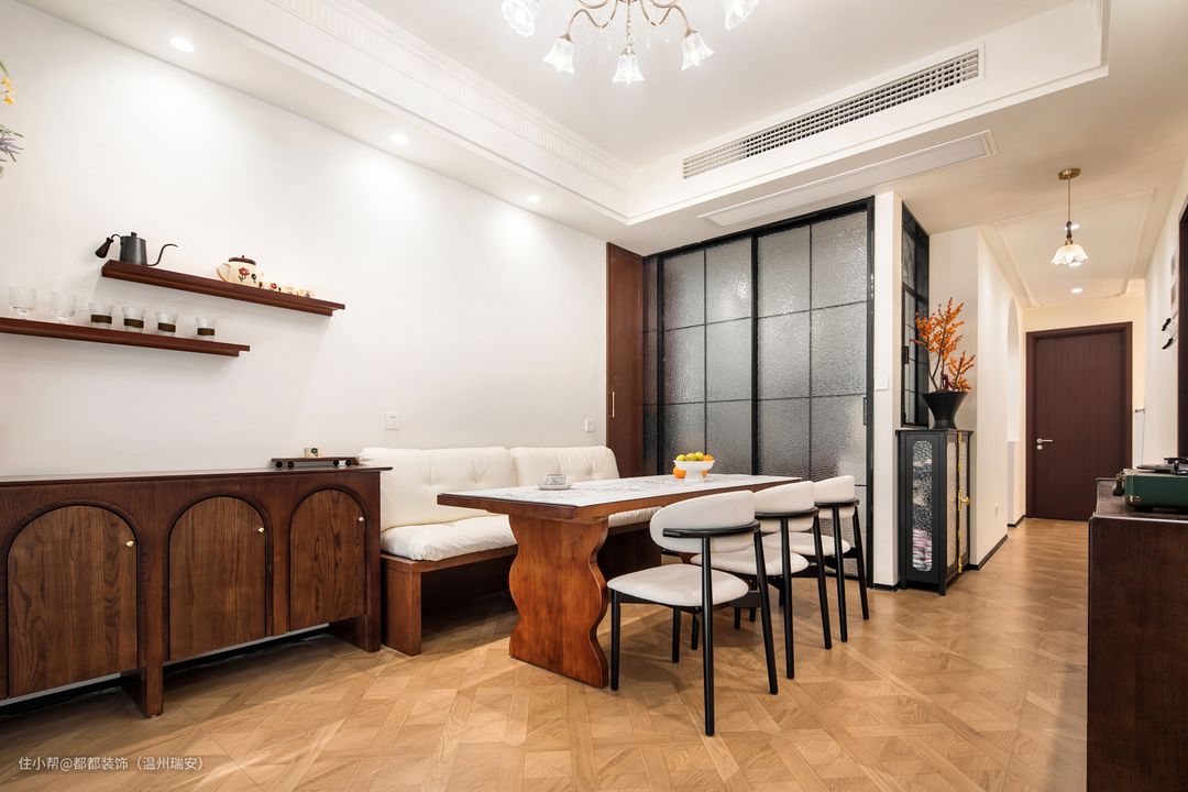 一字型的卡座餐椅设计,利更加节省空间,然后再横向平行摆放上餐桌餐椅,空间条理划分清晰。餐厅两侧均卡布置深木色餐边柜,轻松收纳物品。 墙壁定制隔板,摆放日常所用杯具和物品,再加上鲜花和画室的点缀,让整个空间更加温馨浪漫。