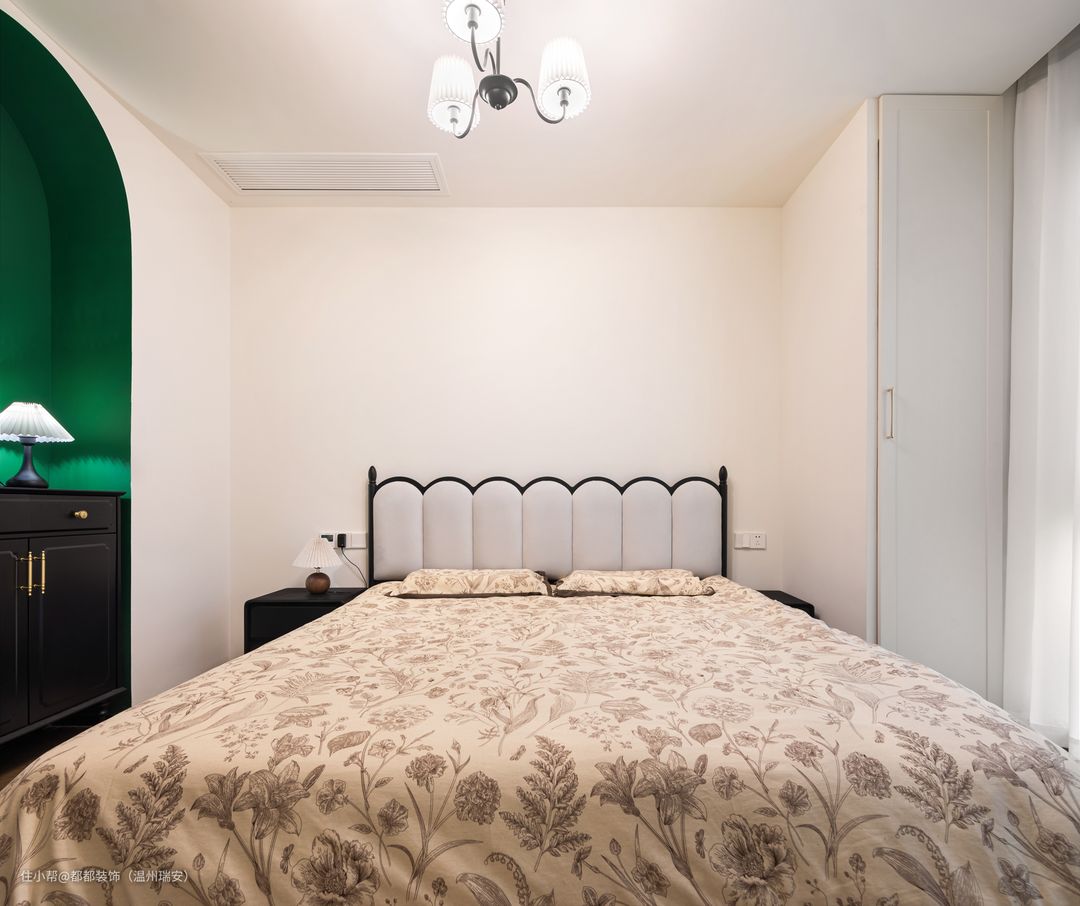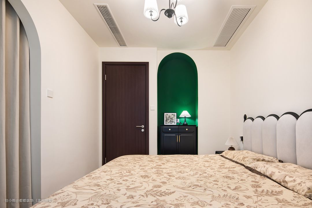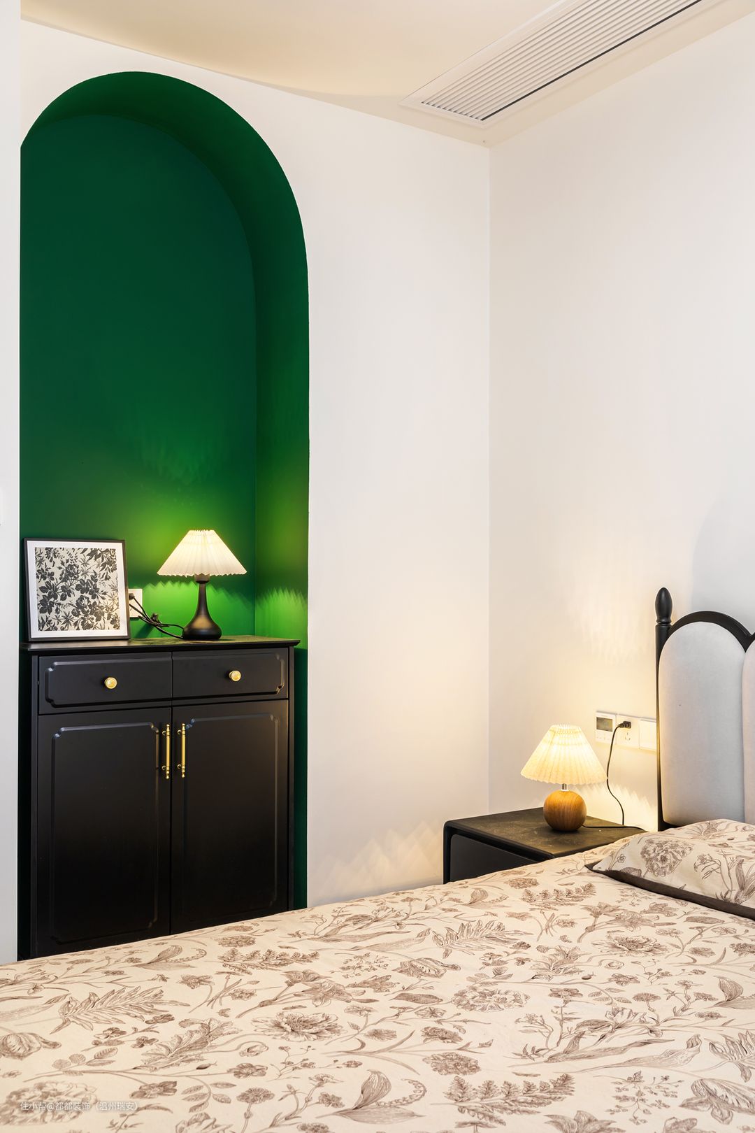木质地板与大白墙相结合,波浪形的皮质床包搭配碎花床品,天花板上的吊灯与床头暖灯相呼应,整体都在营造一个干净温暖的睡眠环境。 弧形门洞设计,复古又艺术,瞬间提升了整个卧室的格调。墙面涂抹的绿色乳胶漆,浓浓的复古风范,嵌入黑色矮柜辅以五金把手,再布置画饰和台灯,让人仿佛置身于梦境之中。