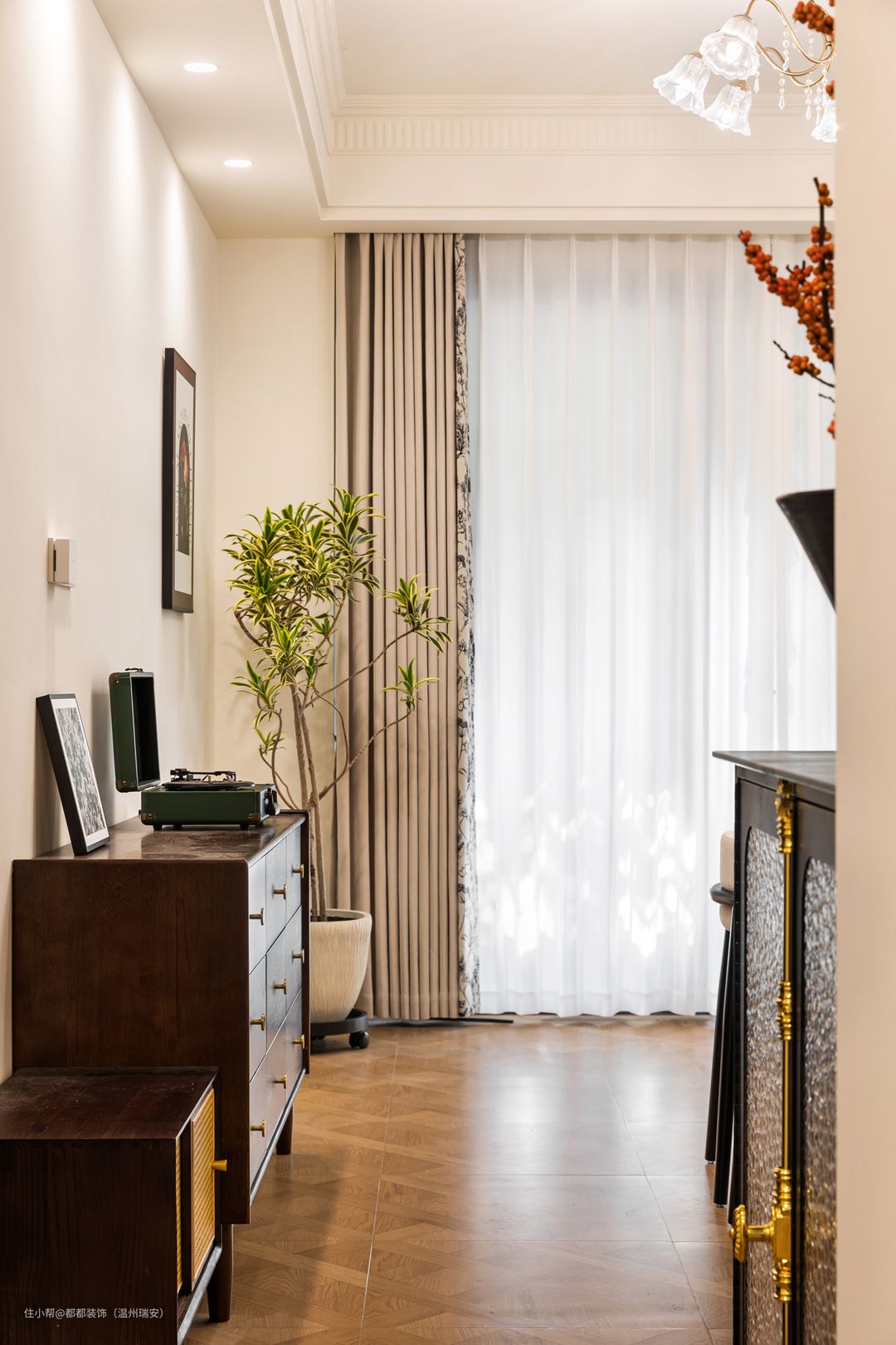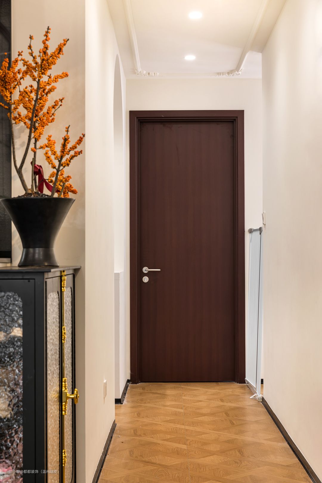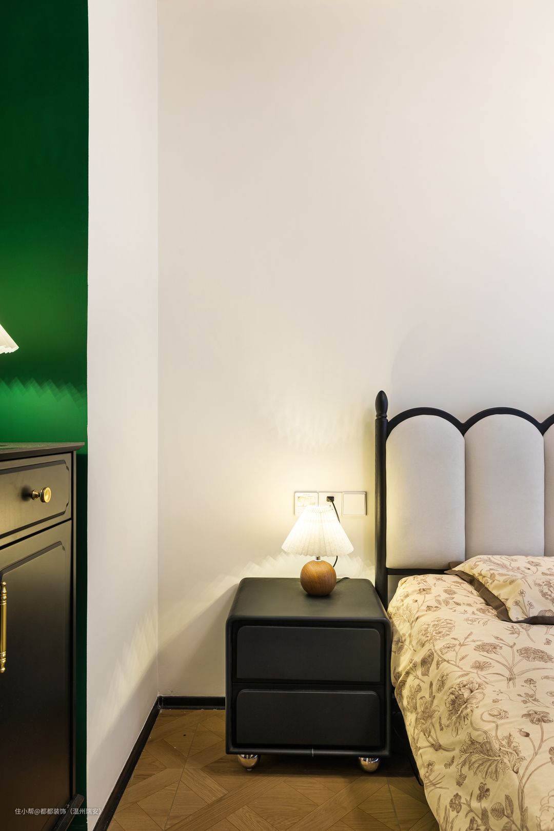 木质地板与大白墙相结合,波浪形的皮质床包搭配碎花床品,天花板上的吊灯与床头暖灯相呼应,整体都在营造一个干净温暖的睡眠环境。 弧形门洞设计,复古又艺术,瞬间提升了整个卧室的格调。墙面涂抹的绿色乳胶漆,浓浓的复古风范,嵌入黑色矮柜辅以五金把手,再布置画饰和台灯,让人仿佛置身于梦境之中。