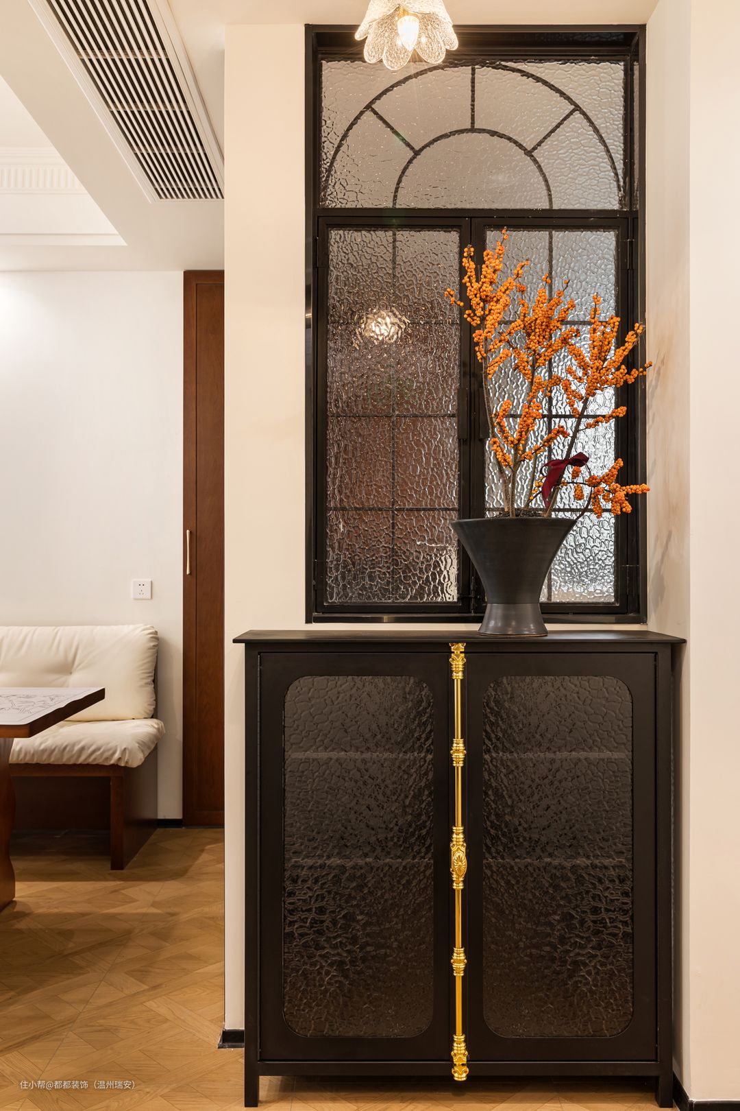 高颜值黑框水波纹窗户与大白墙结合,打造玄关处,黑白搭配经典时尚。玄关柜同样选择以窗户款式材质一致,上下和谐统一,加上五金把手,更显轻奢之感。台面布置上黑色花瓶与橙色花束,给玄关带来一丝丝活力点缀。