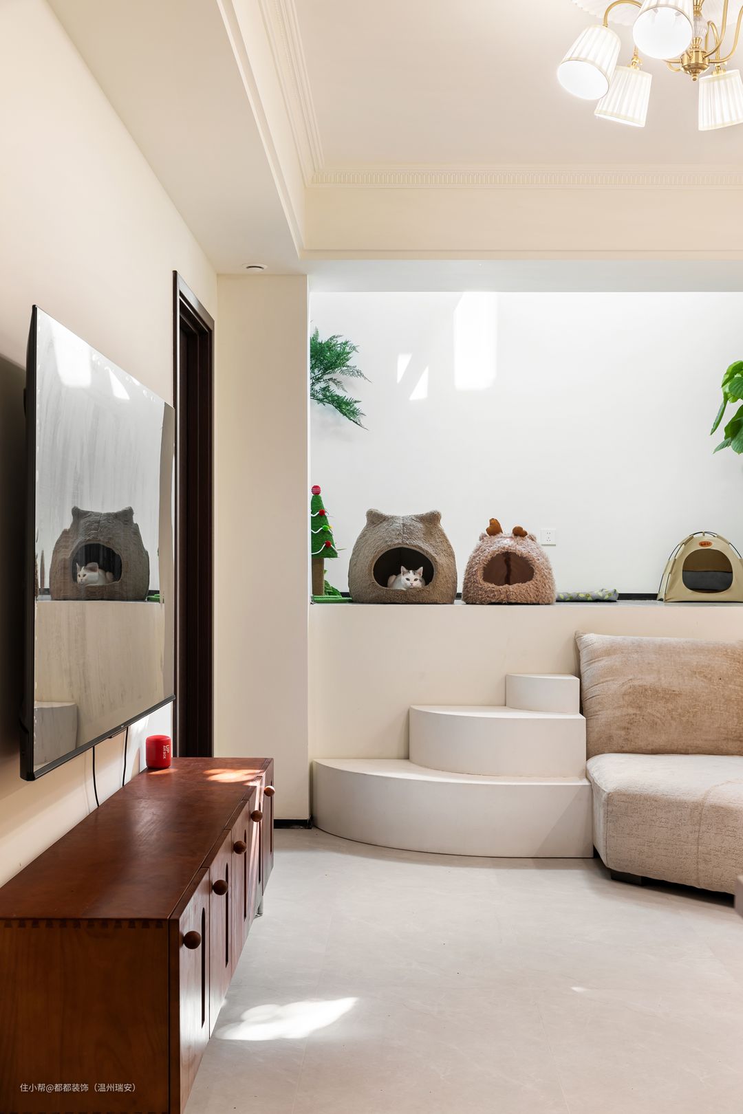 白色乳胶漆装饰的墙面,地面铺上白瓷砖,布置上暖色调布艺沙发,打造干净明亮的客厅空间;无茶几的设计让空间更加宽敞。电视背景墙没有任何设计,仅仅配置了一张深木色的电视柜,看起来居然没有丝毫的单调感。 将猫舍与客厅融合在一起,半开放式的设计让猫咪和主人在一起,互动感十足。借用墙壁位置打造猫屋,内部添置猫爬架等娱乐设施,给它充足的活动空间,日常也不需要额外照看,保持家居整洁。