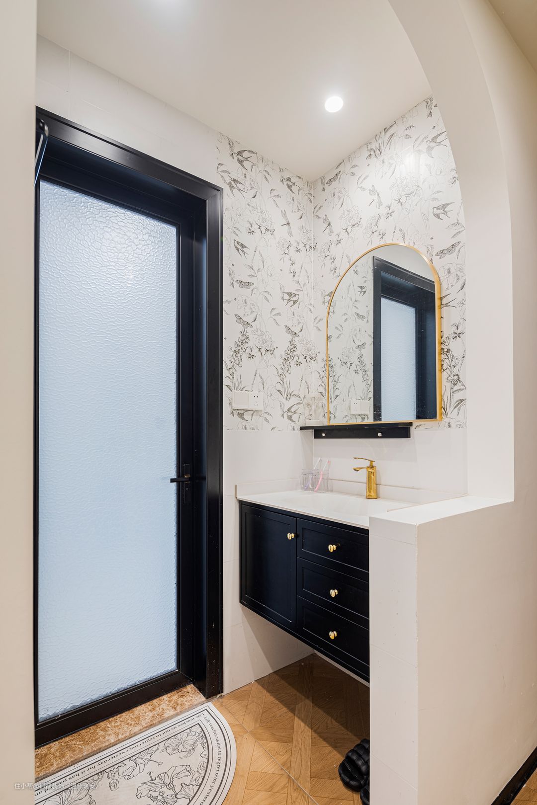 主卫均采用米白色的墙砖和地面,就连洗漱柜、马桶、浴缸也均是白色系,使得整体保持了一致,协调又统一,清晰又明亮。利用黑色铝合金推拉玻璃隔断将淋浴区和马桶洗漱区完全的分离开来,做到干湿分离。 椭圆形的浴缸,圆弧设计舒适、安全,优美的线条感让主人在这里可以尽情享受泡澡的美好时光,使人身心均能得到放松。 角落处壁龛设计,轻松收纳泡澡时候所需的物品。 将洗漱区往移到卫生间的外面,让干区和湿区有了更好的隔断,并且提高了使用效率;湿区通铺白色墙砖和地砖,简洁大气。干区墙上贴上碎花风格的墙纸,使得这个空间显得非常的清新淡雅;白色台面+黑色储物柜相结合,辅以金色五金把手,经典耐看,美观又实用。