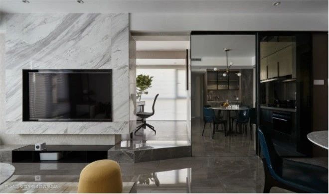 白色大理石背景墙,配以棕色调大理石地砖,在这个沉稳的空间中加上色彩的点缀,非常富有高级感。
