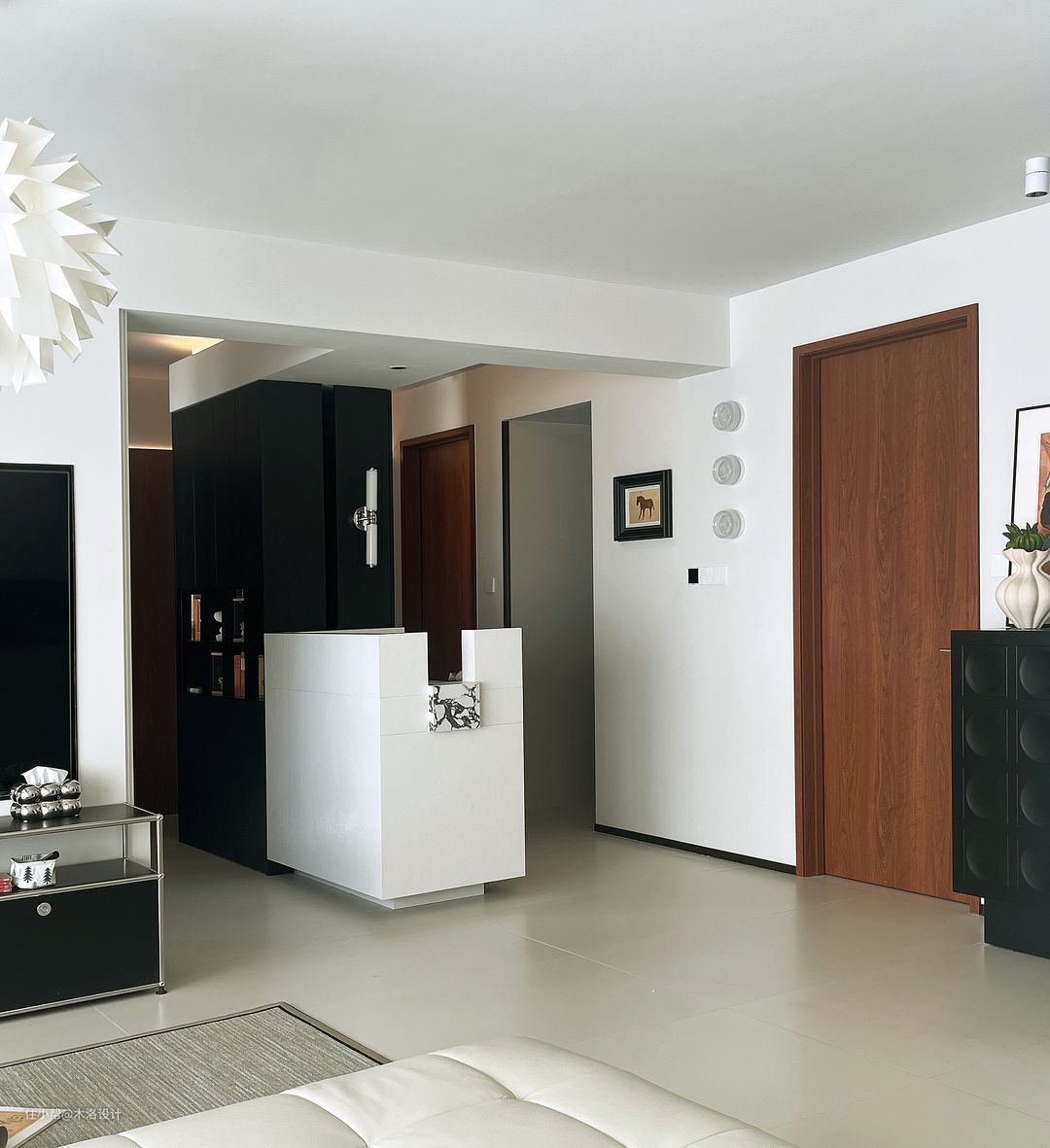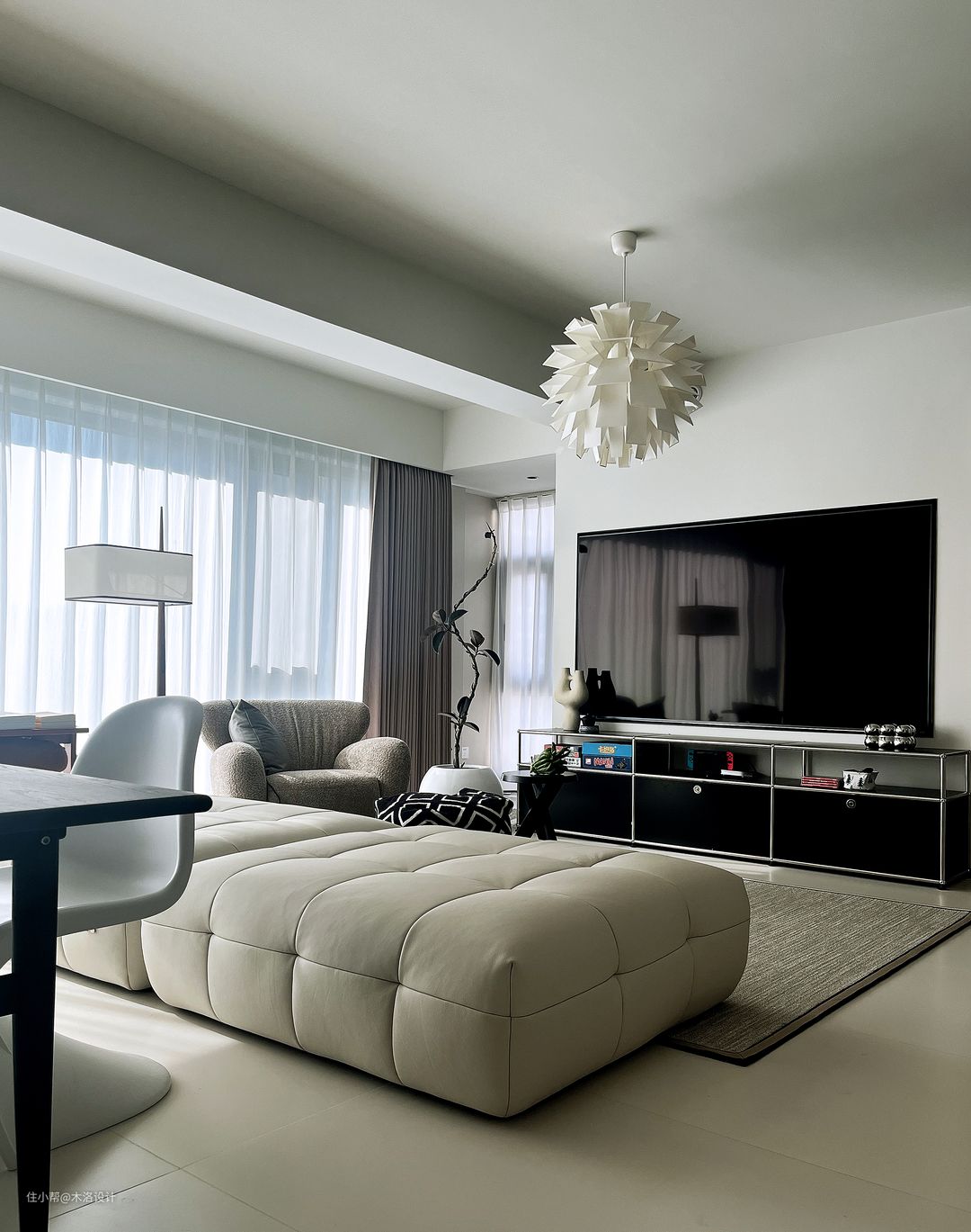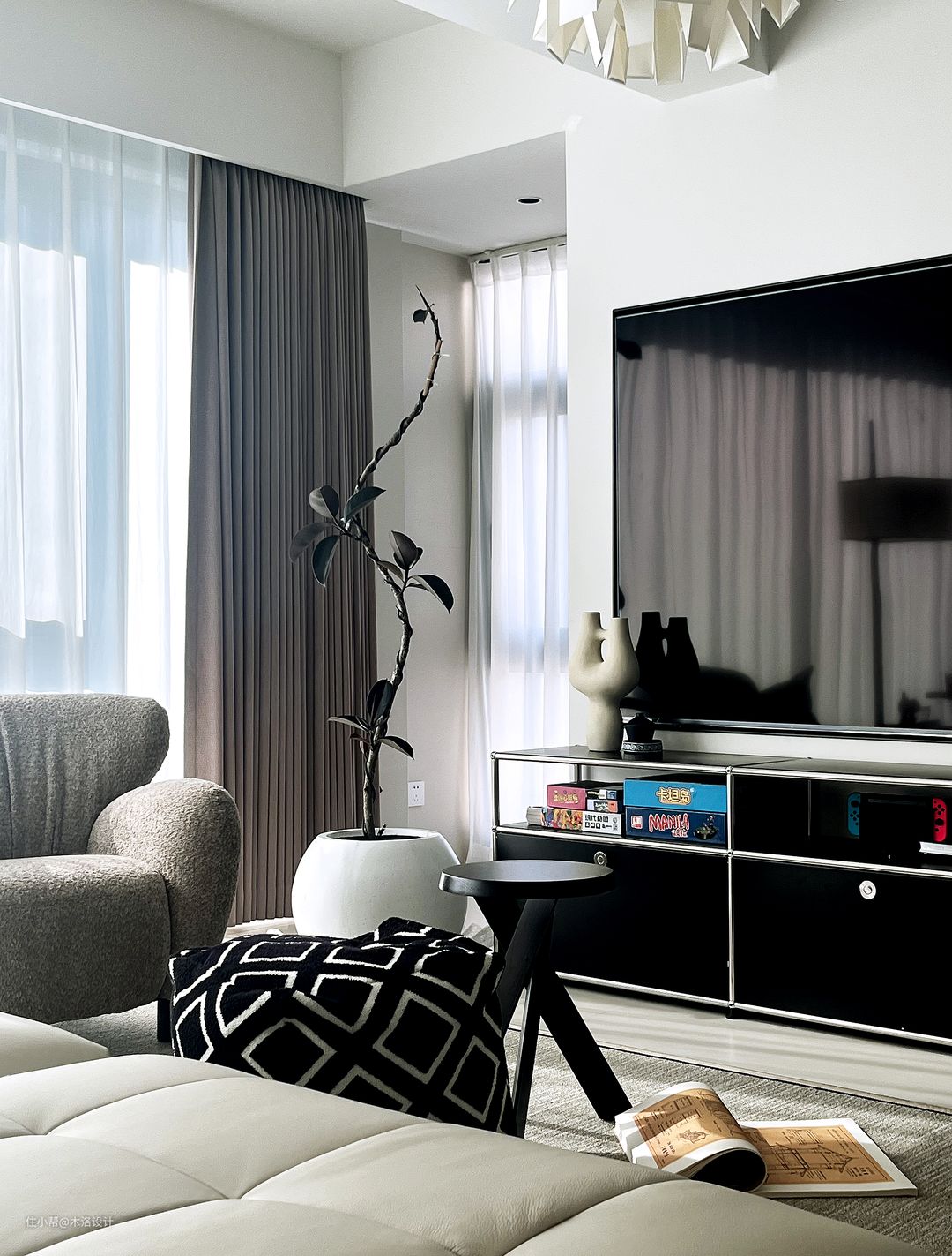 客厅以浅色为主色调,搭配深色家具,营造出一种沉稳而温馨的氛围。电视下的黑色中古模块不锈钢电视柜,与整个客厅的风格相得益彰。