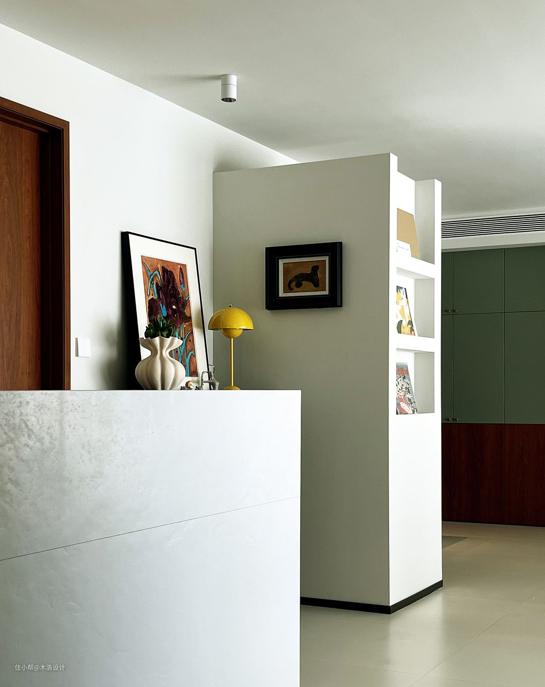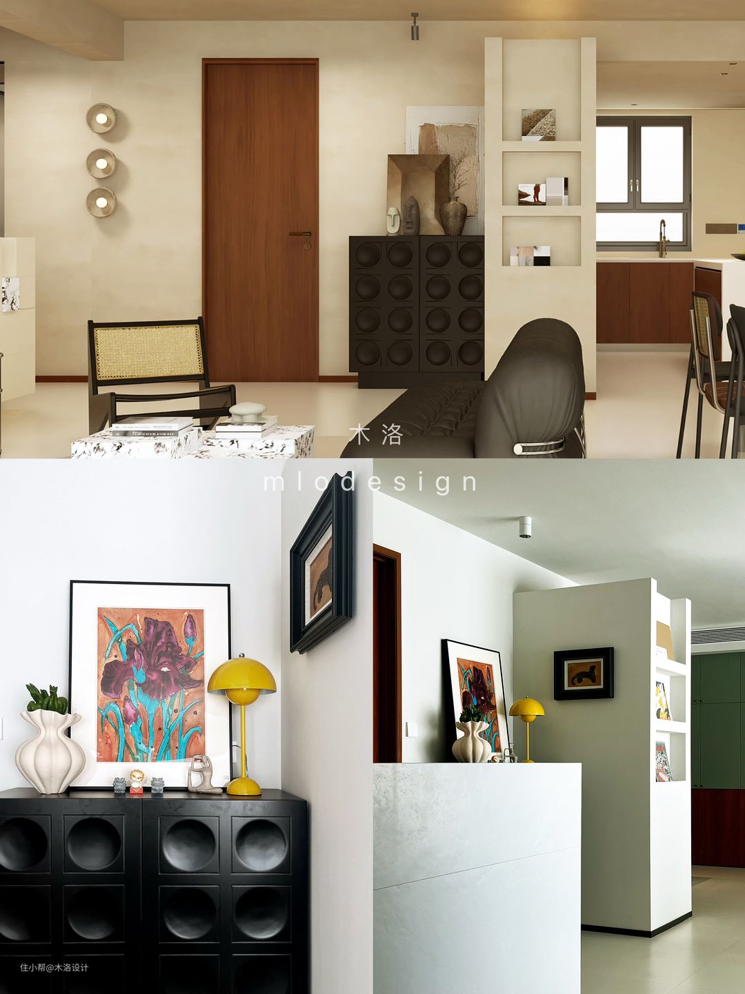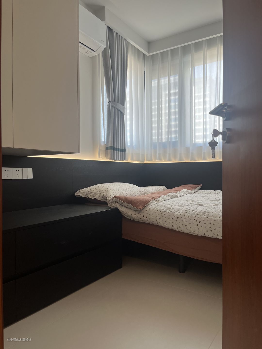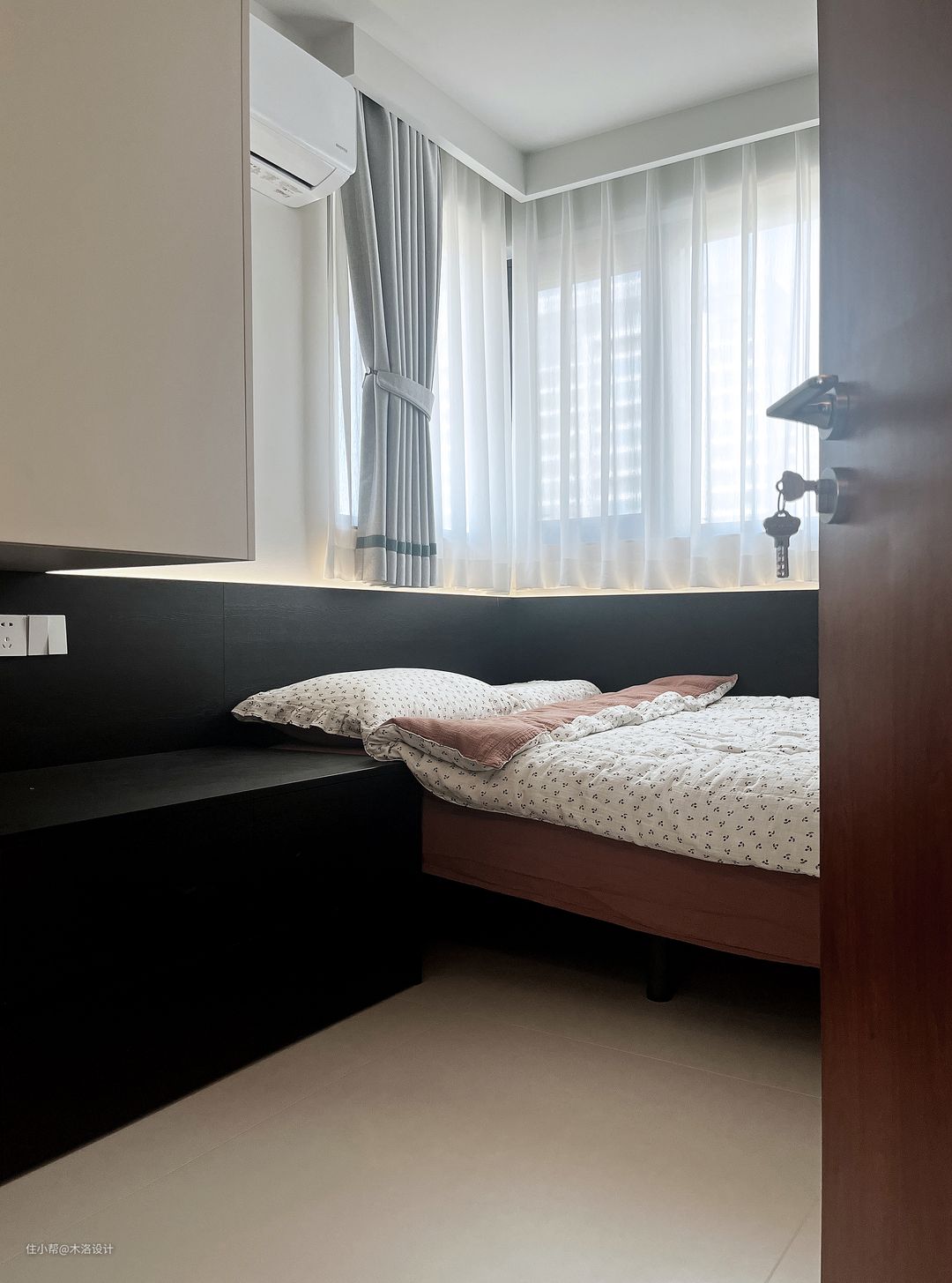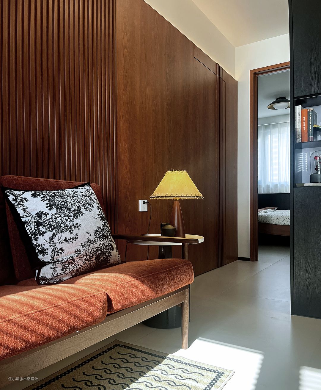 我们把客卫的干区移到了走廊,把原来干区位置做成了洗衣房,颜色樱桃木、黑色纹理硬包和浅咖色乳胶漆搭配,非常和谐,把中古风的氛围感营造到极致。